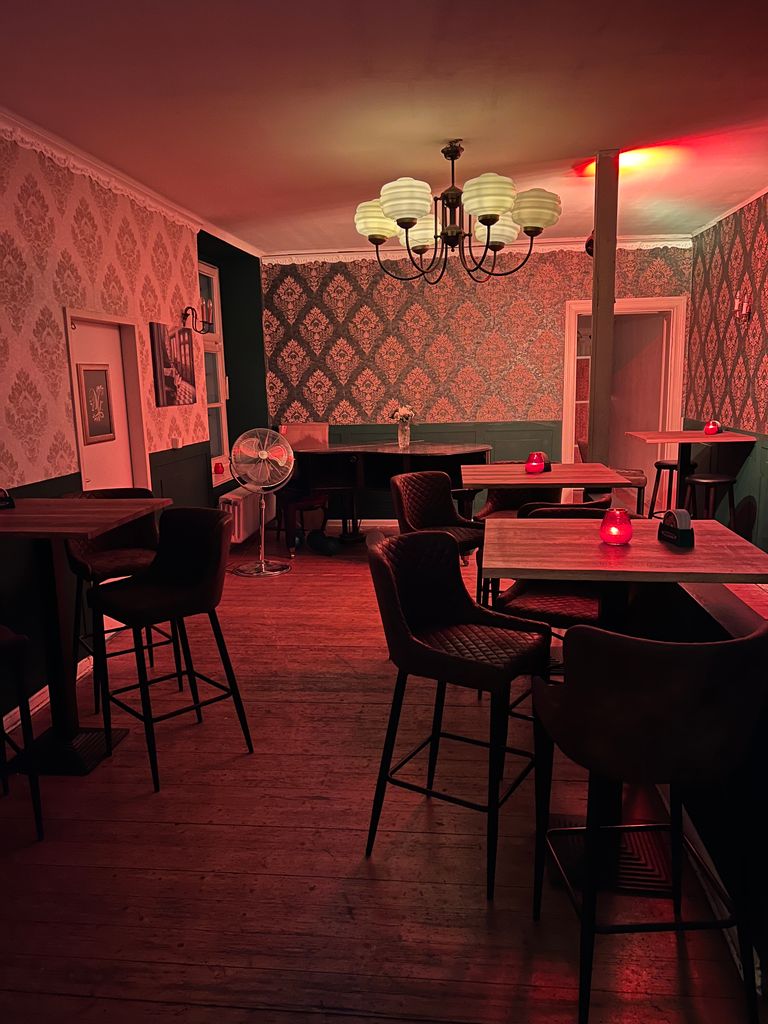 Wir bieten eine volleingerichtete Bar mit langem Tresen (4,70 m), 11 Tischen und Platz für ca. 100 Gäste (stehend) in einem denkmalgeschützten Haus in Schöneberg für Film/Fernseh- und Fotoproduktionen an. Durch Rollos können die miteinander verbundenen Räume abgedunkelt werden. Der Fußboden ist aus Holz. Im von der Bar zugänglichen Keller besteht weiterhin die Möglichkeit, Garderoben oder Ähnliches einzurichten.