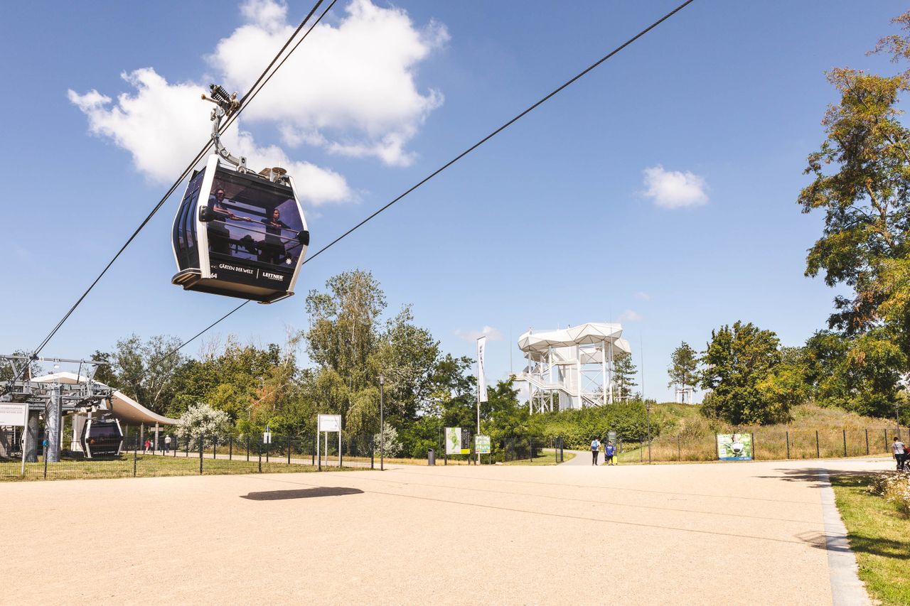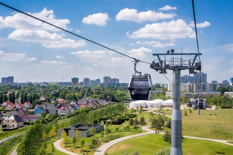 Der spektakuläre Ausblick aus bis zu 35 Metern Höhe reicht bis ins Zentrum Berlins. Mit einer Zwischenstation am Wolkenhain verkehrt die Seilbahn auf einer Gesamtlänge von 1,5 Kilometern. Es gibt sechs Kabinen mit Glasfußboden.