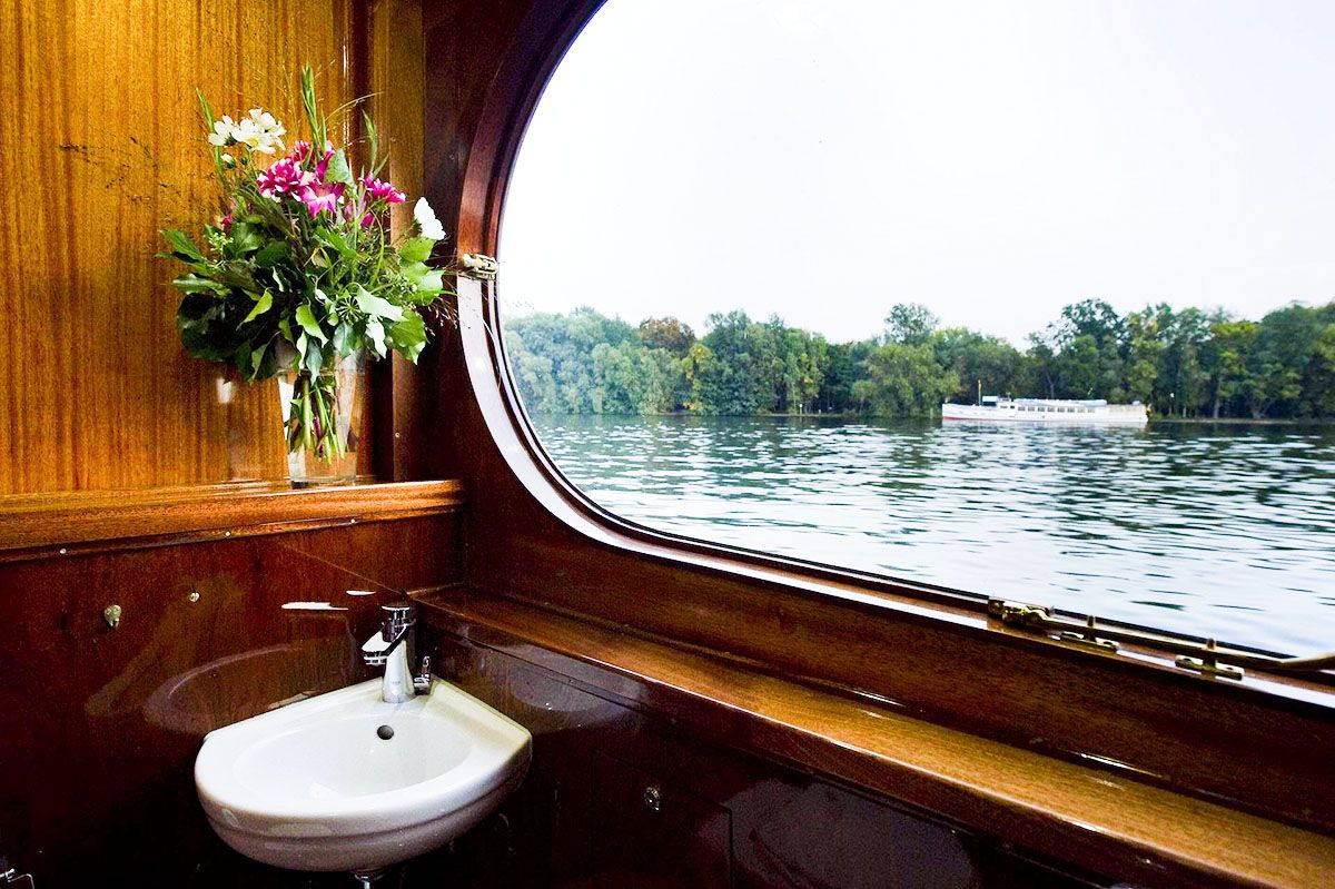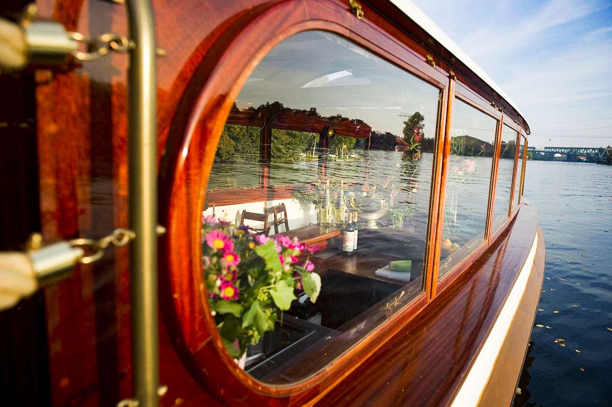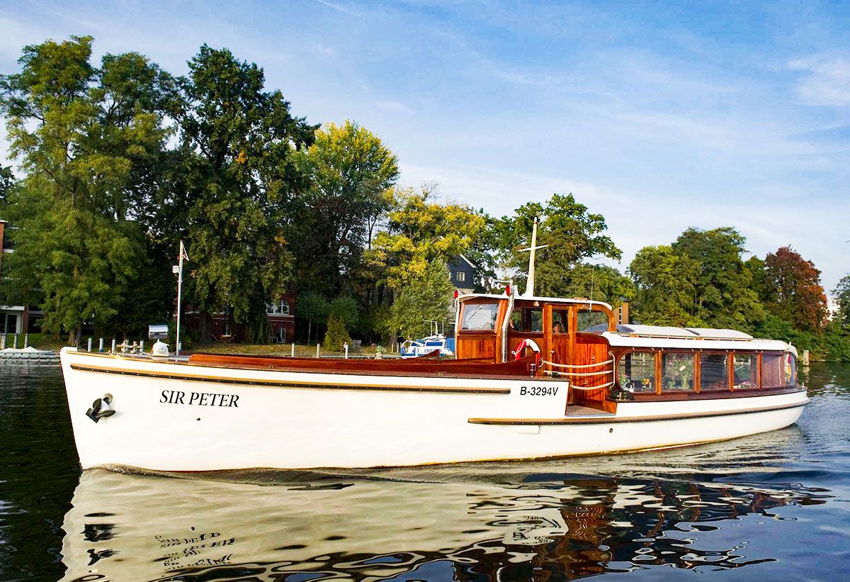 Das edelste unserer Schiffe heißt Sir Peter, ist ebenfalls aus dem Jahre 1928, und wurde von dem legendären Schiffsdesigner Arthur Tiller entworfen. Bis 2005 zählte es zu den ältesten Schiffen des Bodensees und fuhr dort als Passagier – und Ausflugsdampfer. 2007 wurde das Schiff dann nach Berlin transportiert und aufwendig restauriert. Nun gehört das Schiff zu den edelsten Berlins. Der einladende Salon bietet Platz für bis zu 30 Personen, der Außenbereich kann weitere 30 Personen beherbergen.