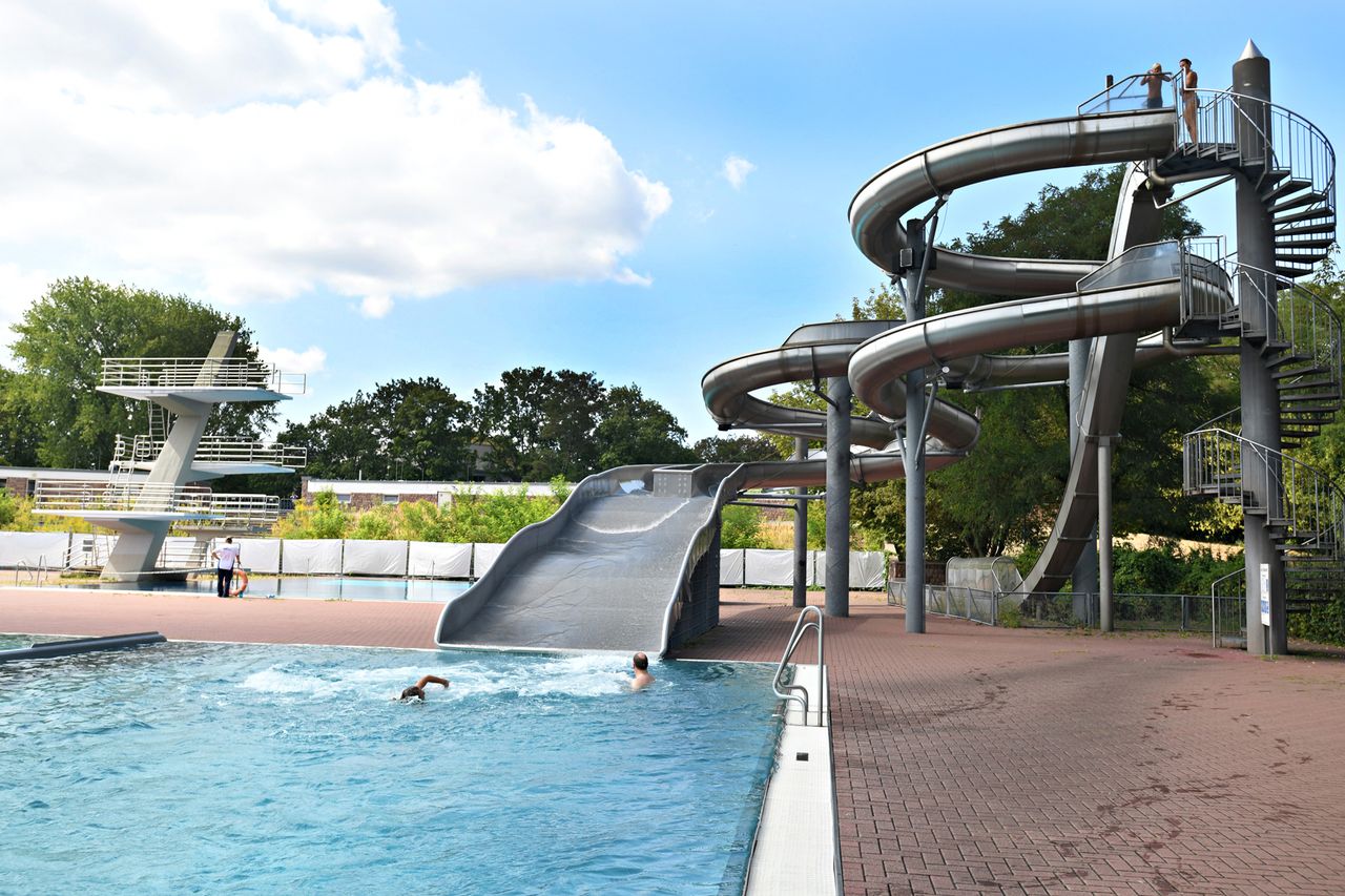 Kinder-Planschbecken, Erlebnisbecken mit Strömungskanal, Wasserkanonen, 2 Rutschen (40/60 m), High-Speed-Rutsche