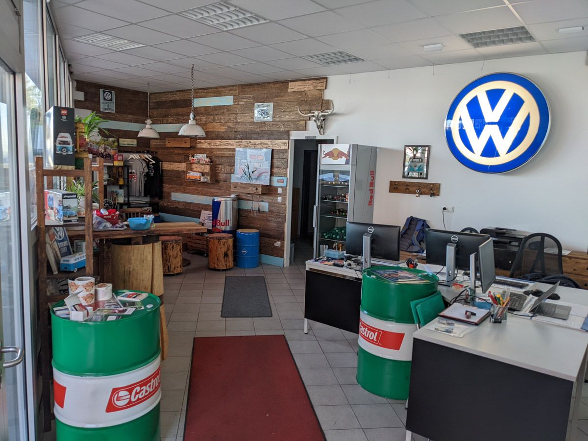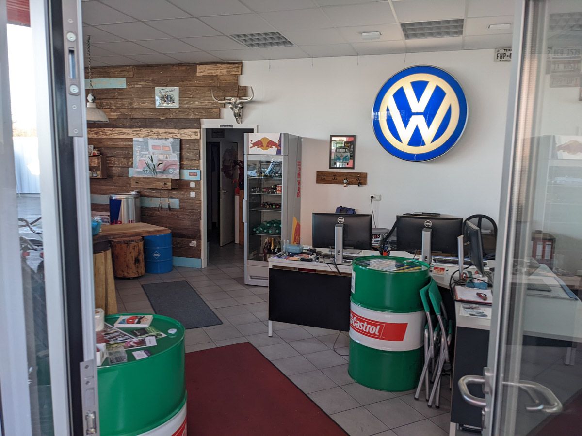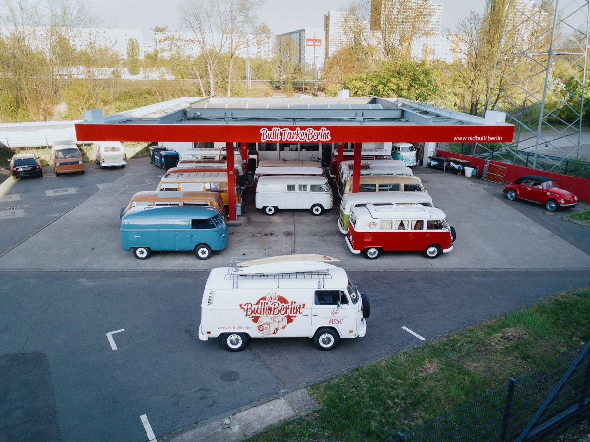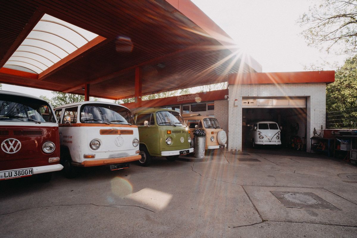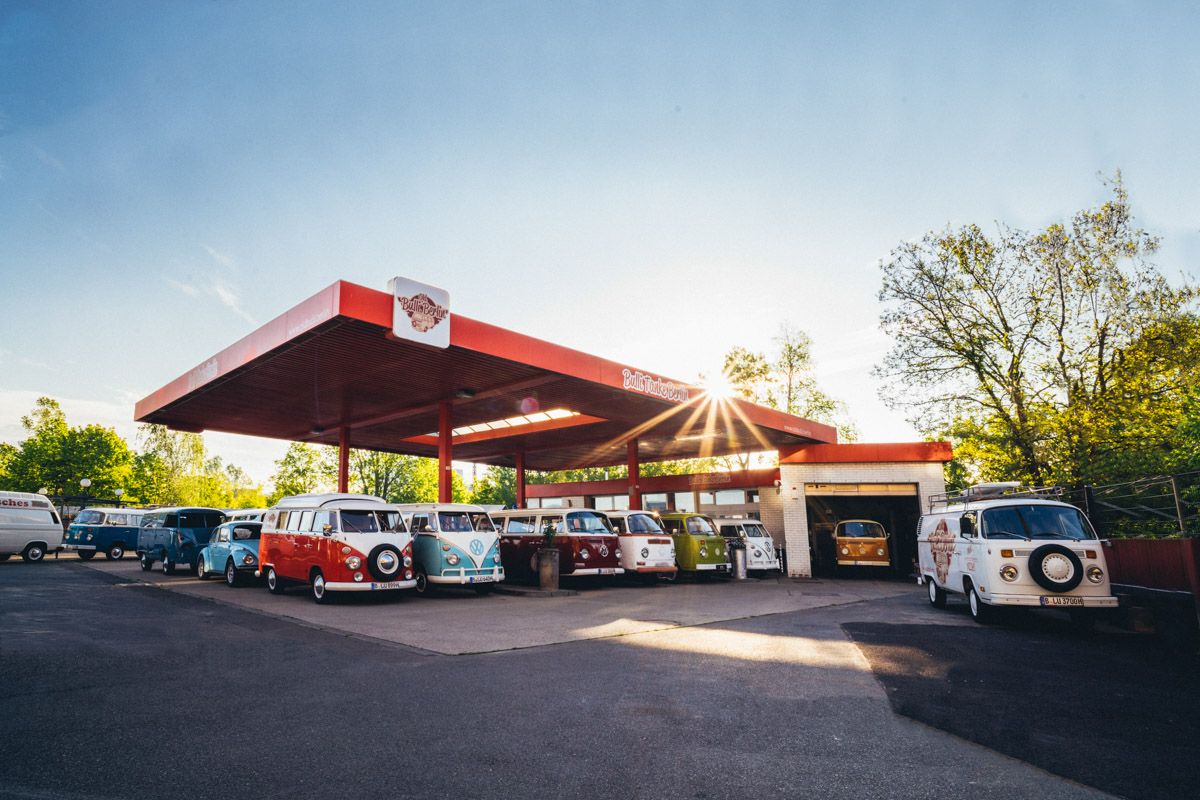 Bei uns dreht sich alles um alte VW Busse. Passend dazu ist unser Büro eine stillgelegte alte Tankstelle + Schrauberhalle (Starkstrom), die sich super eignet als Film Location. Mit oder ohne unsere Bullis ist sie ein absoluter Hingucker