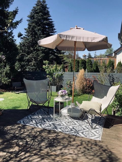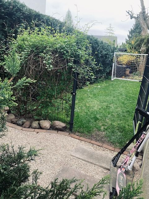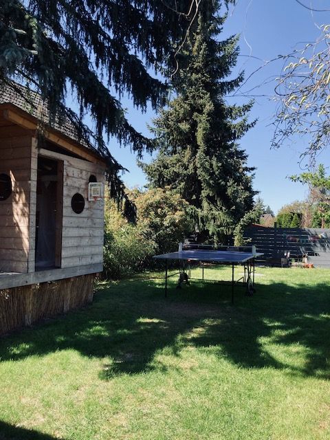 Vollunterkellert, Garage, Garten mit großer Holzterrasse, Spielhaus im Garten, Schuppen, Rasen.