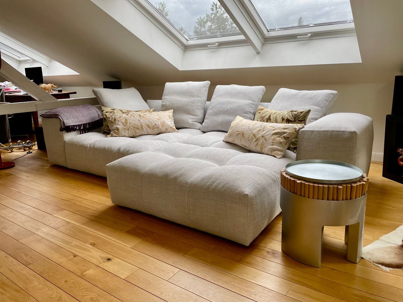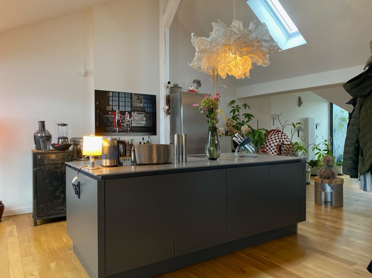 Stylishe, loftartige Dachgeschosswohnung mit Insgesamt 130 m² Wohnfläche, davon entfallen circa 90 m² auf den offenen Wohn, Lounge , Ess und Küchenbereich mit frei stehendem Granit Küchenblock, 2 weitere abgeschlossene Zimmer, Die beiden Zimmer werden als Gästezimmer und Schlafzimmer,genutzt, 2 Badezimmer plus circa 16 m² Dachterrasse.