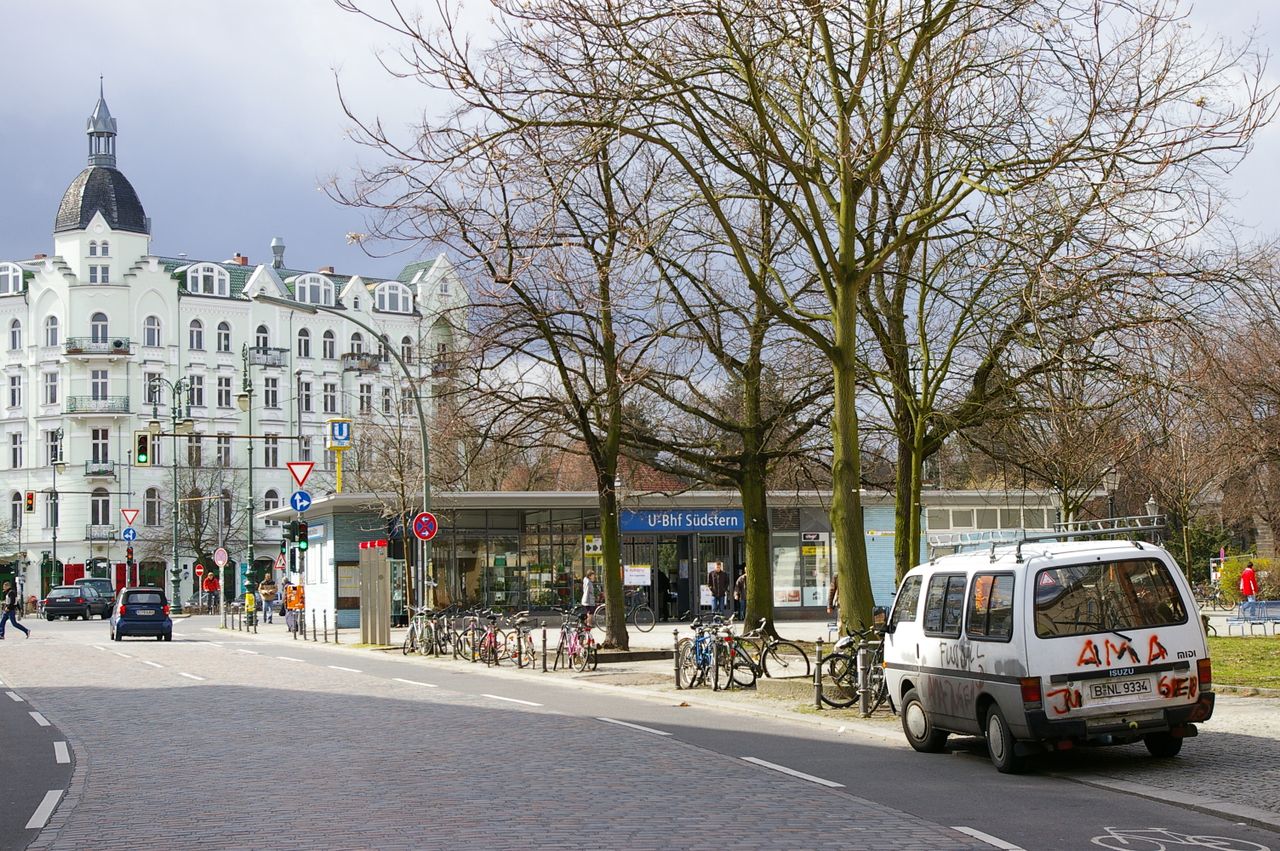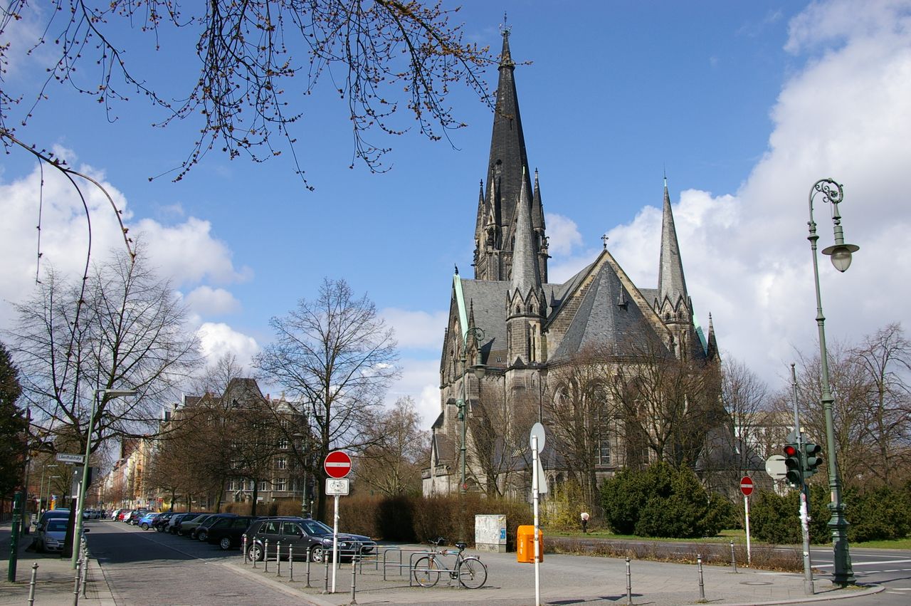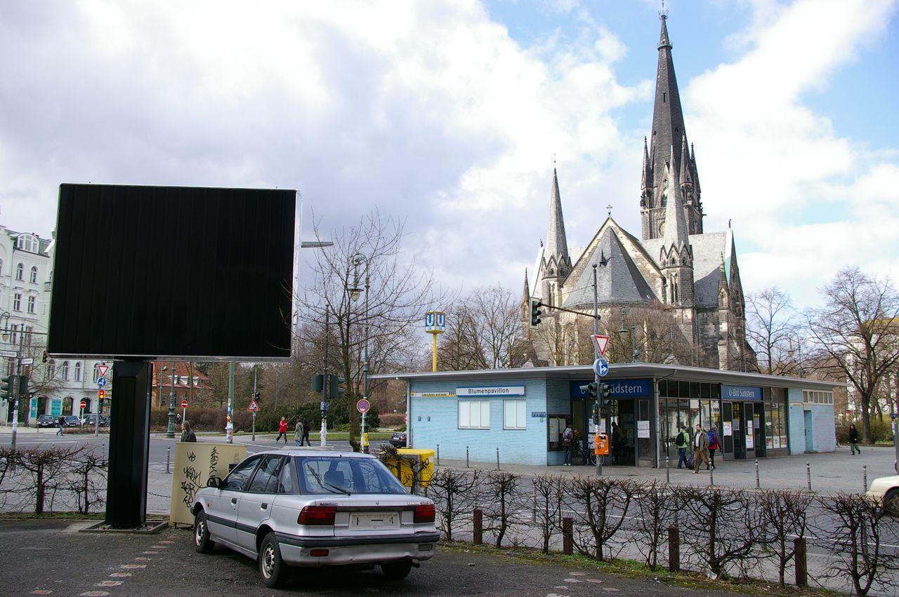 Kirche steht auf einer Verkehrsinsel, Verkehrsknoten von dem die Straßen sternförmig abzweigen, U-Bahnstation, Seitenstraßen z.T. mit Bäumen