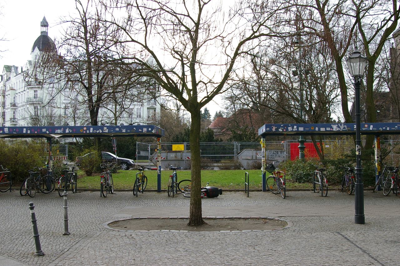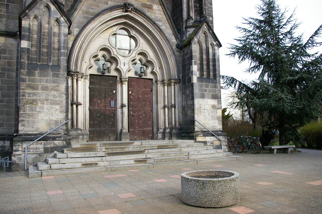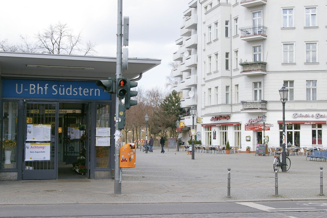 Kirche steht auf einer Verkehrsinsel, Verkehrsknoten von dem die Straßen sternförmig abzweigen, U-Bahnstation, Seitenstraßen z.T. mit Bäumen