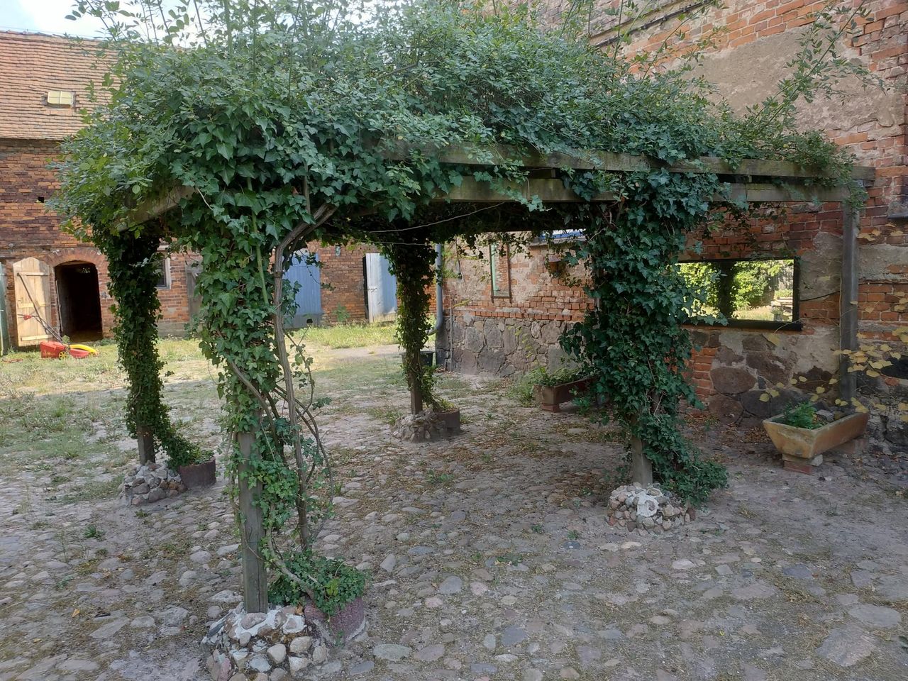 Auf einem 10.000 m² großen Grundstück in Potsdam Mittelmark liegt ein wunderschöner Vierseithof in seinem großen Hintergarten und einem 500 m² Wohnhaus. Das Baujahr des Hofes liegt um ca. 1910. Die langgestreckten Scheunen sind aus Ziegelstein erbaut, haben Satteldächer und große und kleinere Holztore. Dieses schöne Außenmotiv wird durch das historische Pflaster im großzügigen Innenhof komplettiert. An der Scheunenfassade klettern üppige Pflanzen und drumherum zeigt sich die Natur von ihrer schönsten Seite. Im Garten spenden alte Bäume Schatten. Der abgeschirmte Innenhof bietet viele Ecken und kleine Gassen führen zu versteckten Oasen. Von Berlin nur 70 km entfernt, steht der Hof zur Vermietung für Film- und Fotoproduktionen zur Verfügung. Parkplätze gibt es in Hülle und Fülle, Strom und Wi-Fi/WLAN sind vorhanden und sanitäre Einrichtungen sind vor Ort. Das gesamte Grundstück ist ebenerdig und liefert eine große Anzahl an sehr authentischen, romantischen und ländlichen Motiven. Hinter dem Grundstück liegen weite Felder und nur 5 min zu Fuß entfernt ein schöner Schatten spendender Wald.