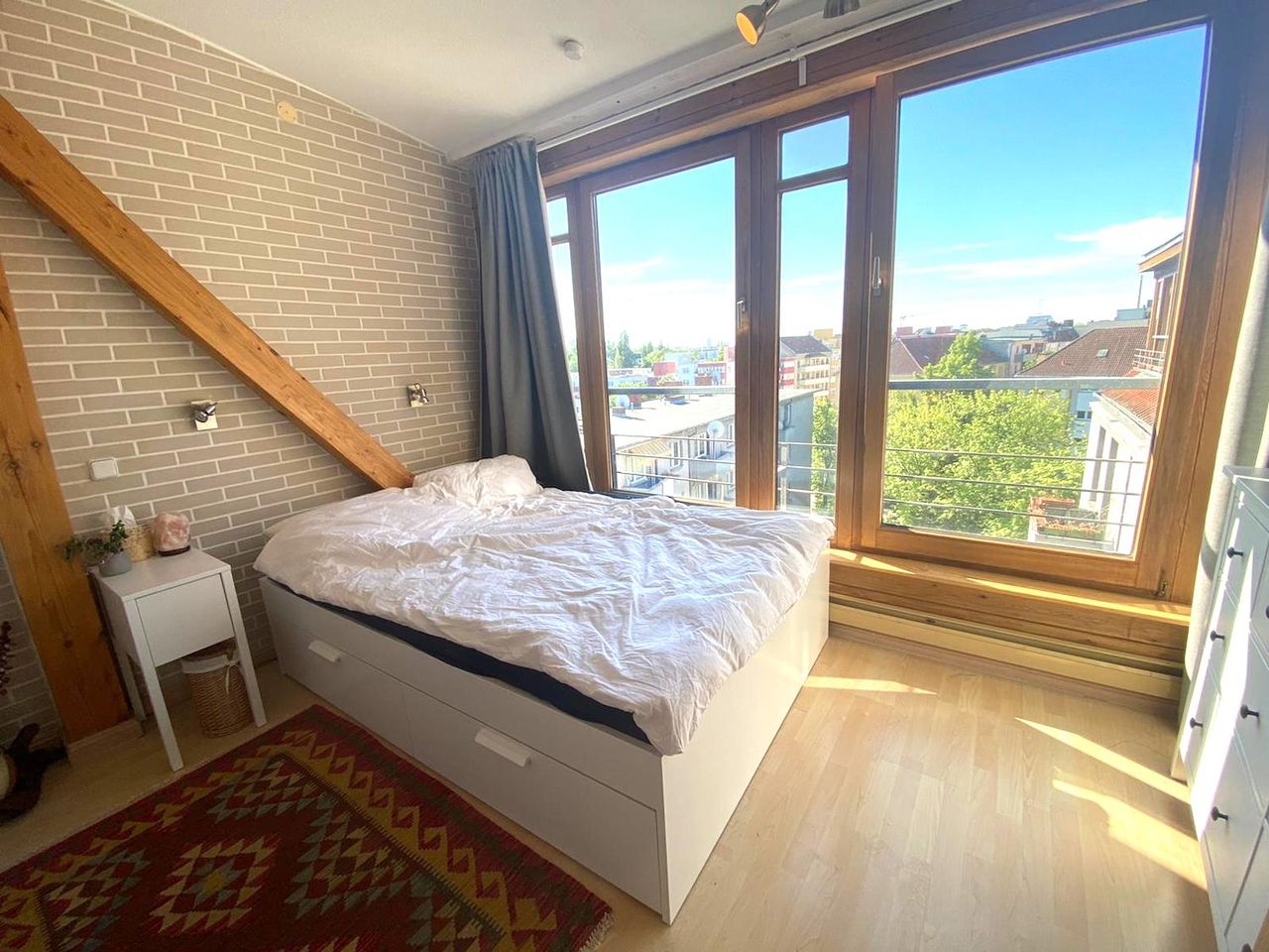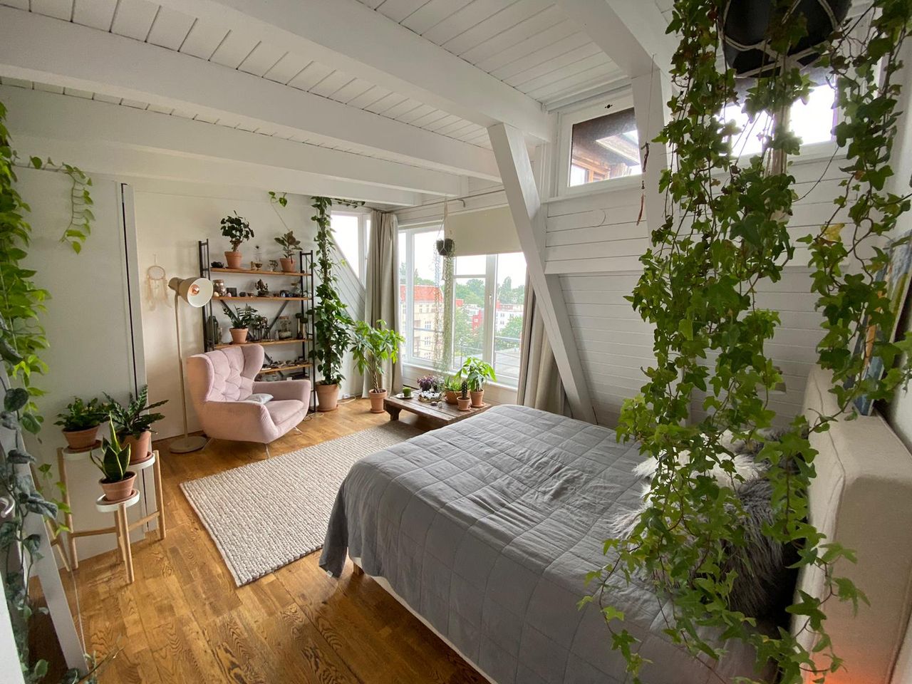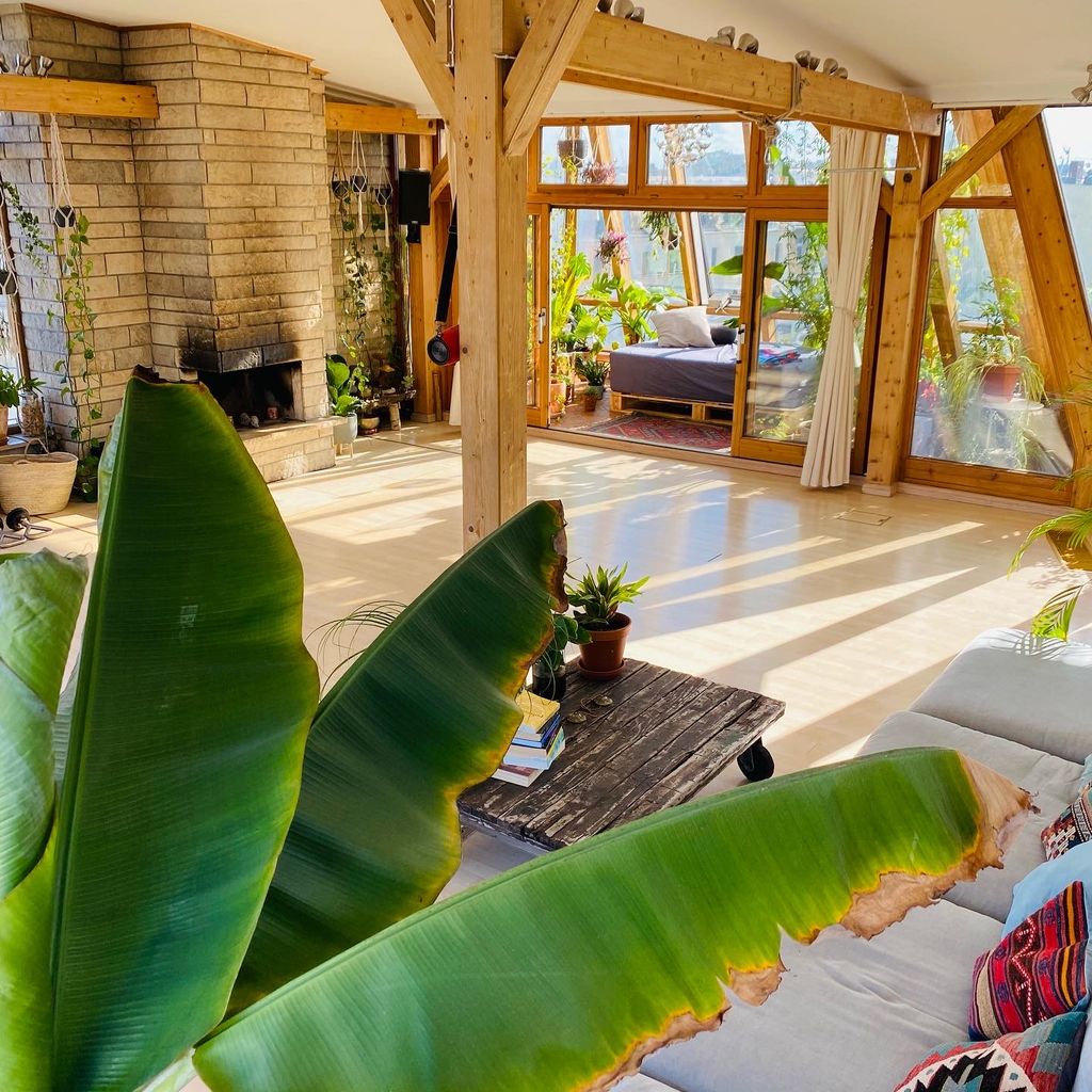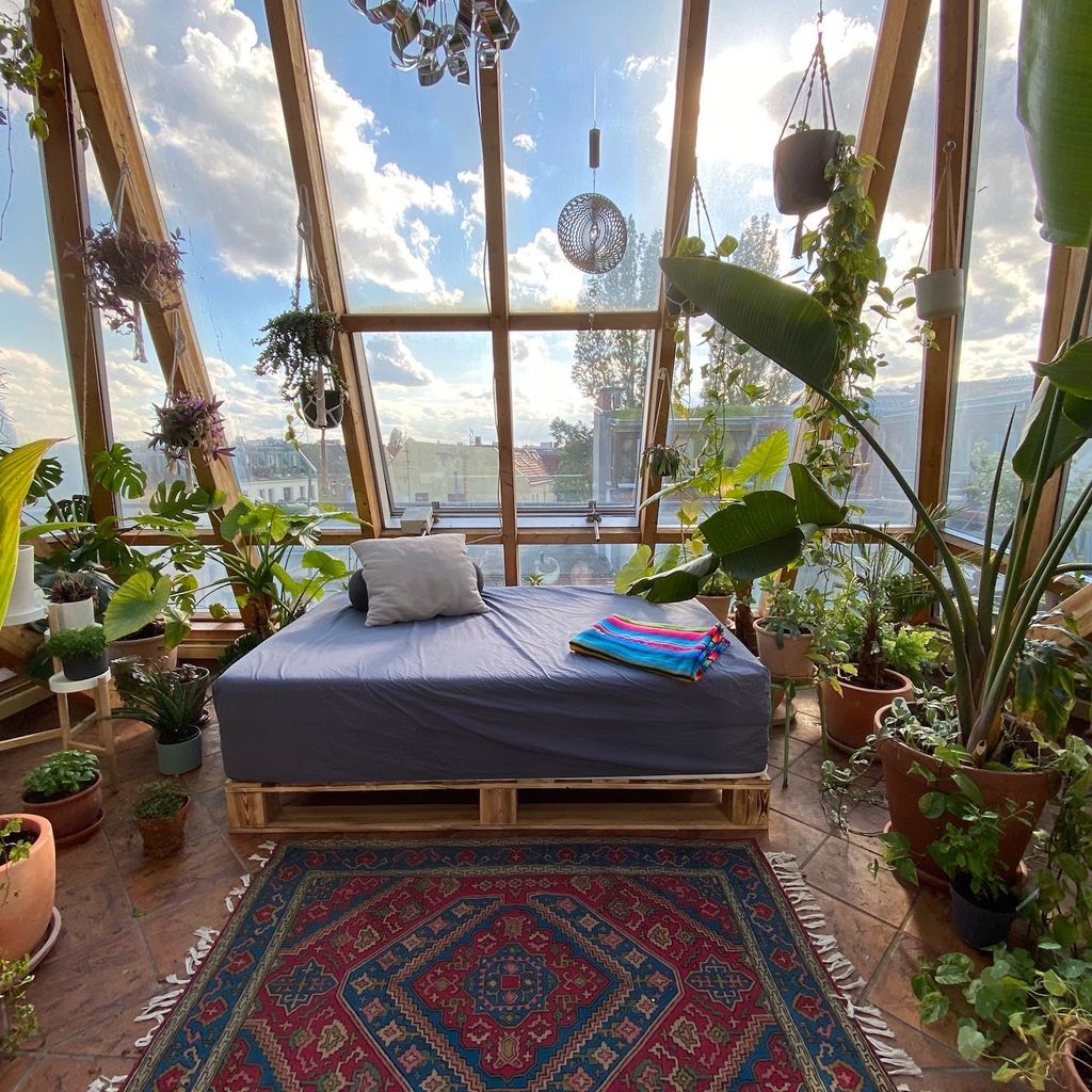 The closest you can get to a jungle feeling in the middle of the city. Starting with a 5 bed roomed airy loft with wooden bones (2 wings and a greenhouse balcony), the owners introduced 400 plants, vintage rugs and artwork which transformed it into a place of zen. The best description in 3 words that we could offer? Berlin meets Bali.