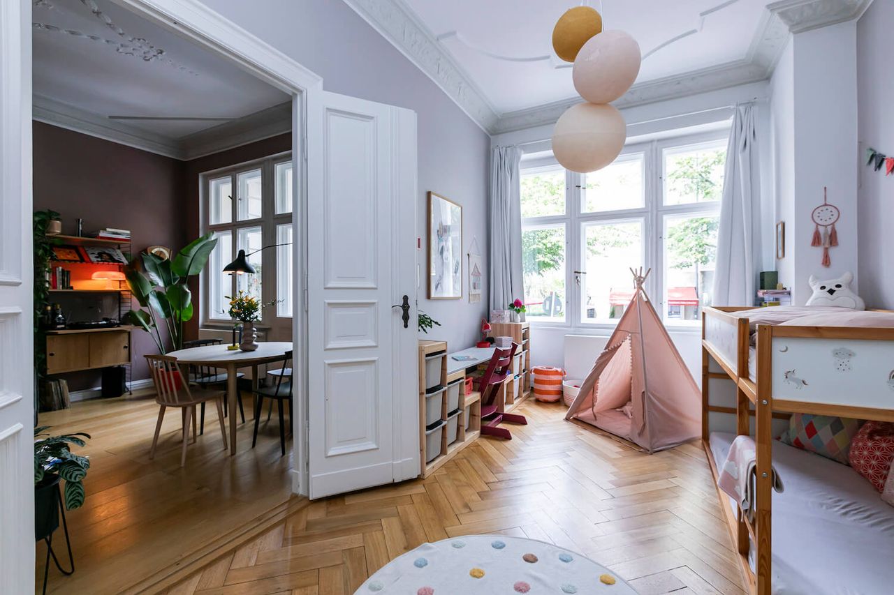 A beautiful old flat in West Berlin which has a prized possession: a spacious terrace. Located on the mezzanine floor of a house built around 1930, it features rich decorations, high ceilings, and beautiful wooden floors. Recently renovated, it has PLENTY of natural light, a large, green terrace with various seating areas, 2 children's rooms, a lavish living/dining area, a spacious bedroom, and a designer kitchen with terrace access. The flat is colourful, furnished with many design classics to a high standard, and is ideal for photo and video productions.