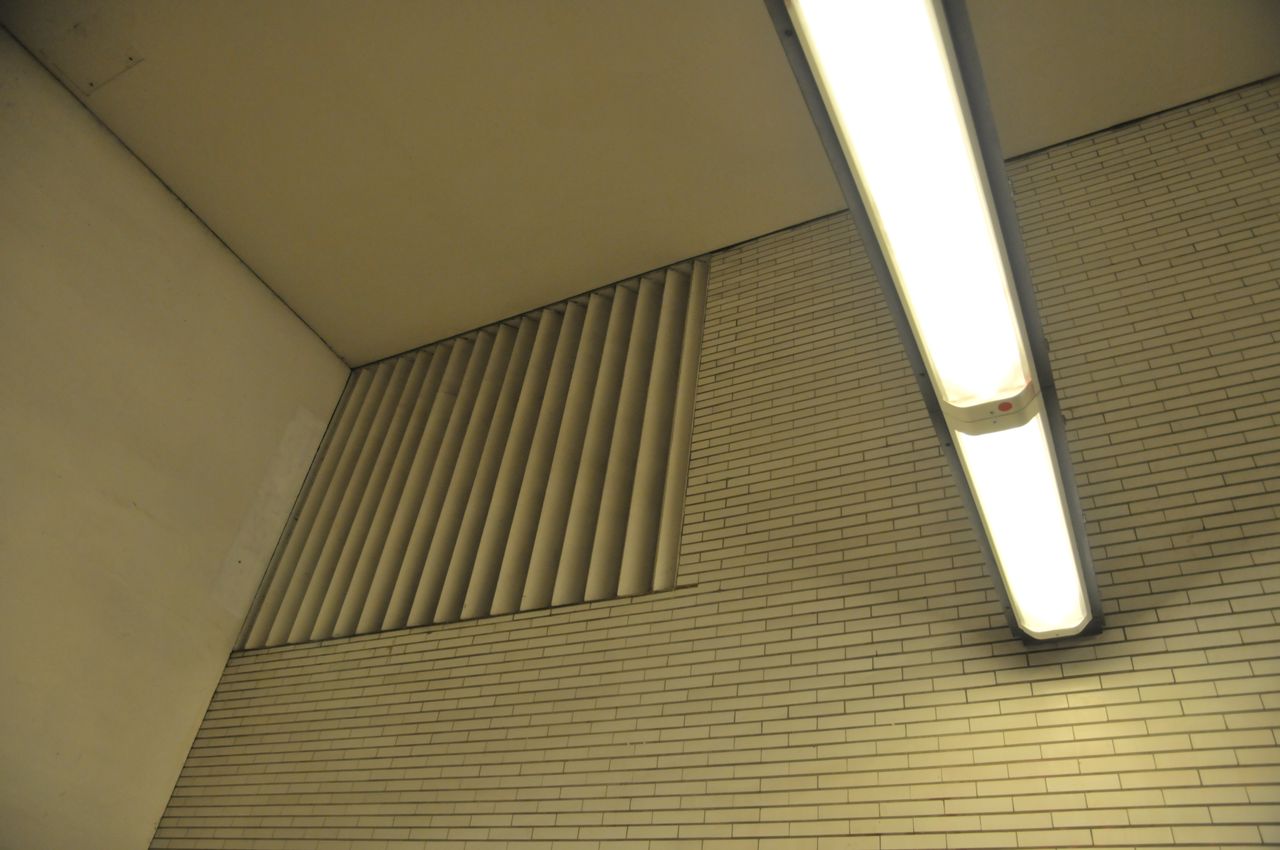 Die Bahnhofswände sind mit orangefarbenen Fliesen verkleidet, die Mittelstützen sind blaugrün, sowie die Flachdecke weiß.