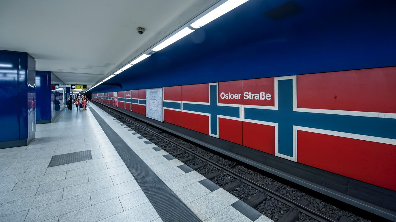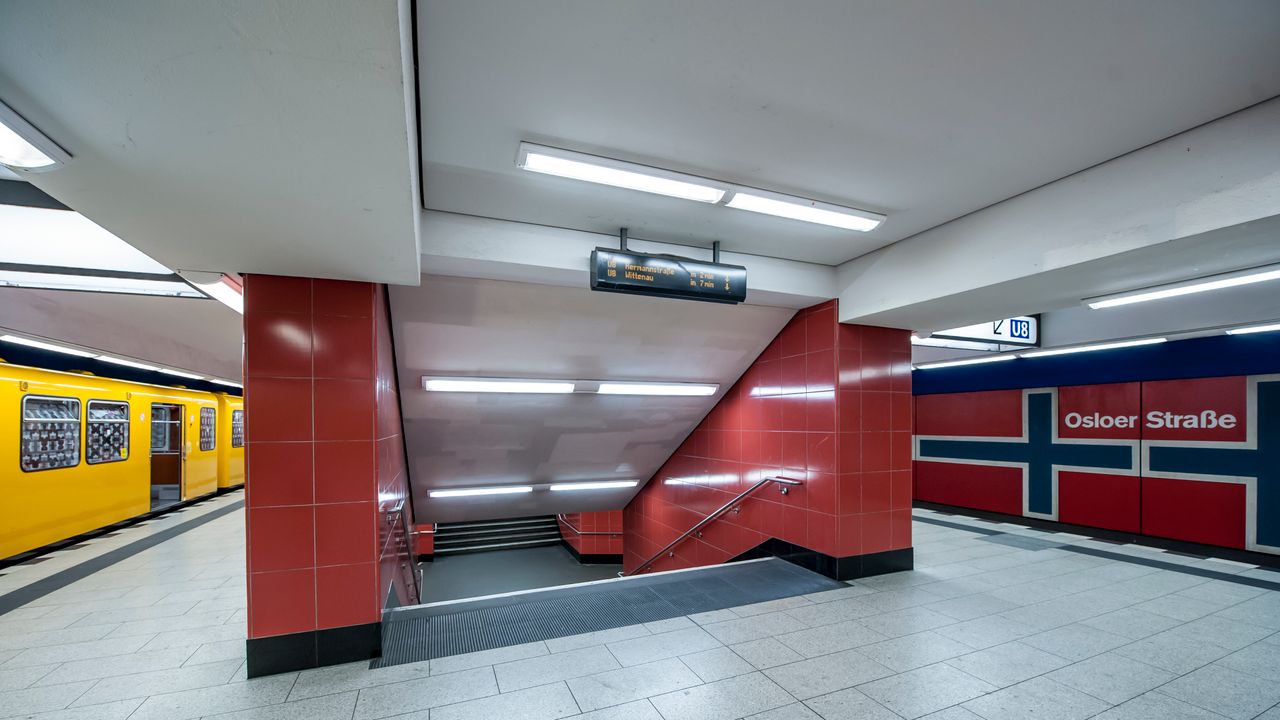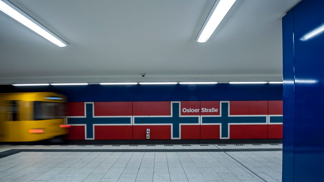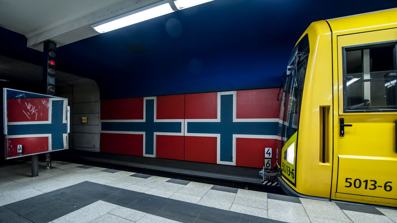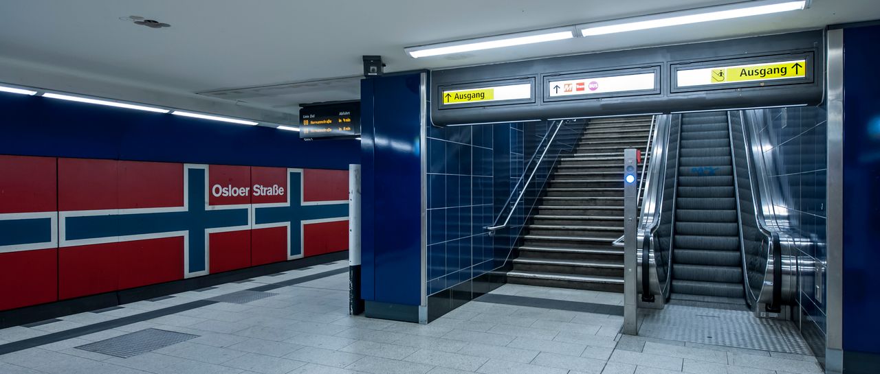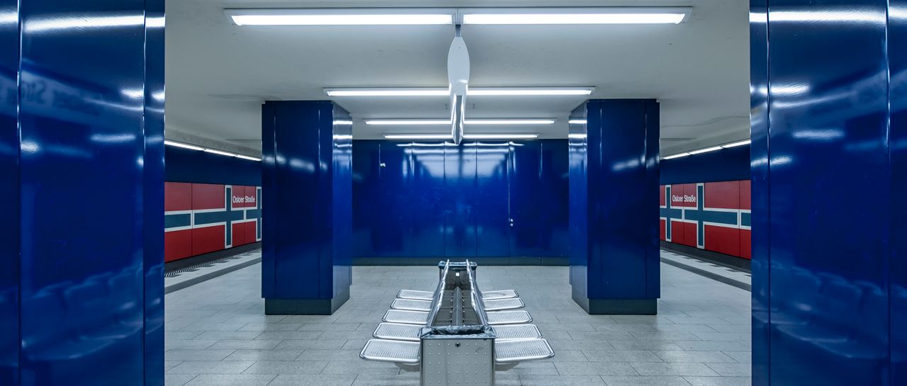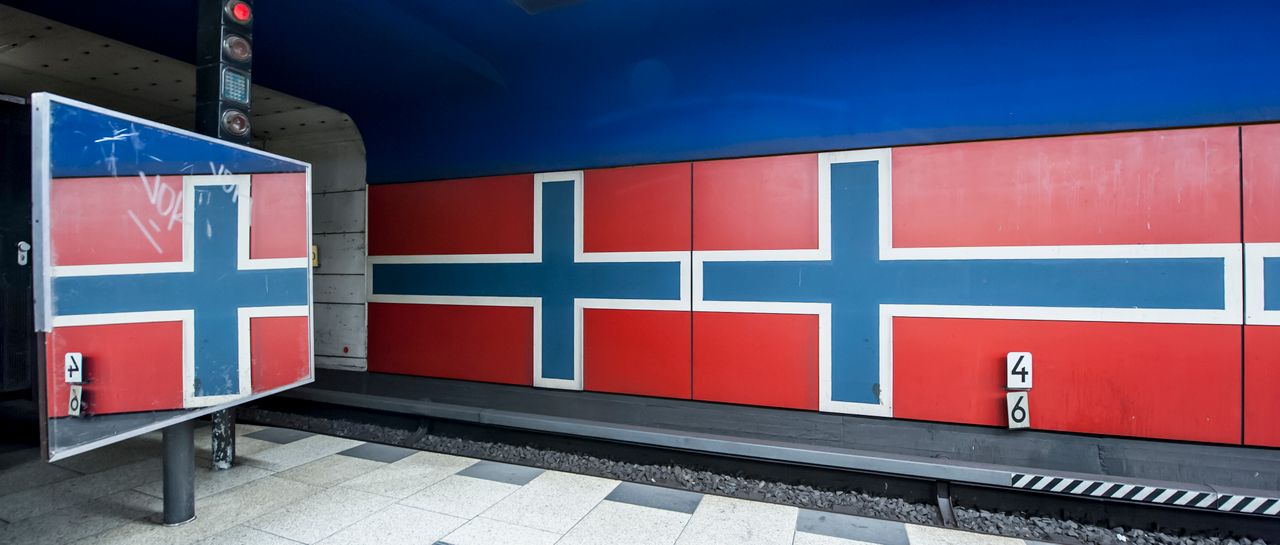 Endstation der Linie U9, Übergang zur Linie U8, viele Gänge und diverse Shops - Wände des U-Bahnhofs in den Farben der norwegischen Fahne