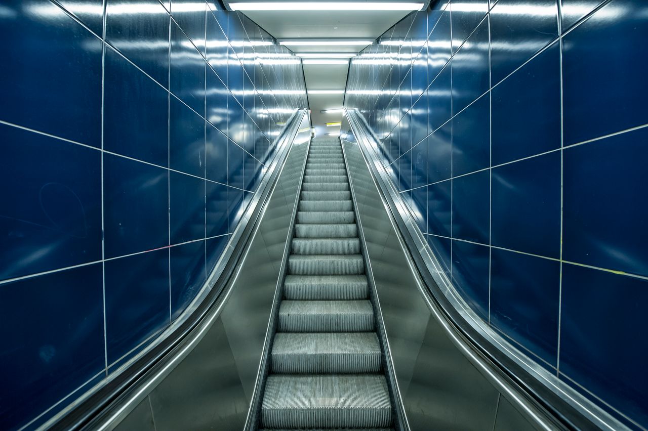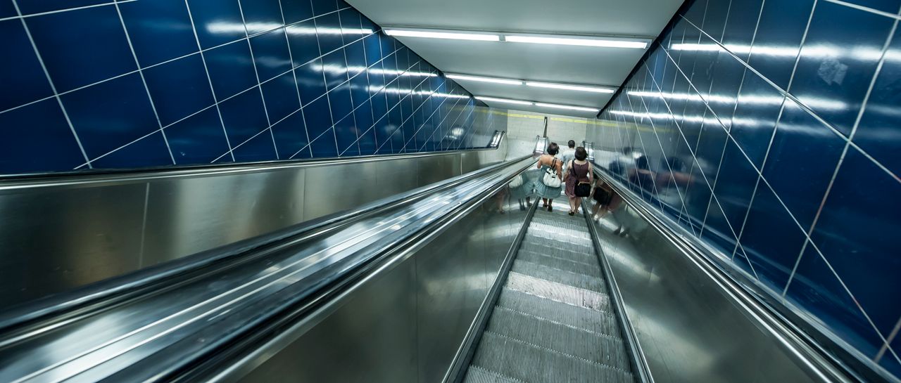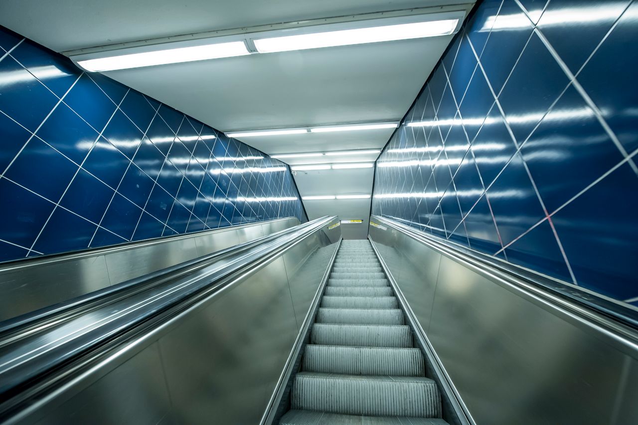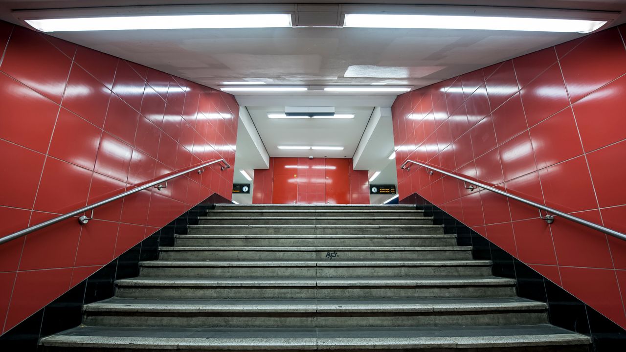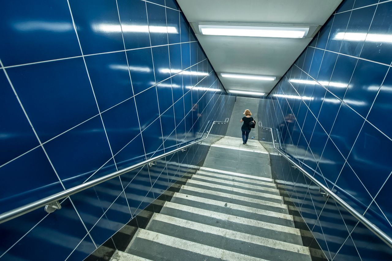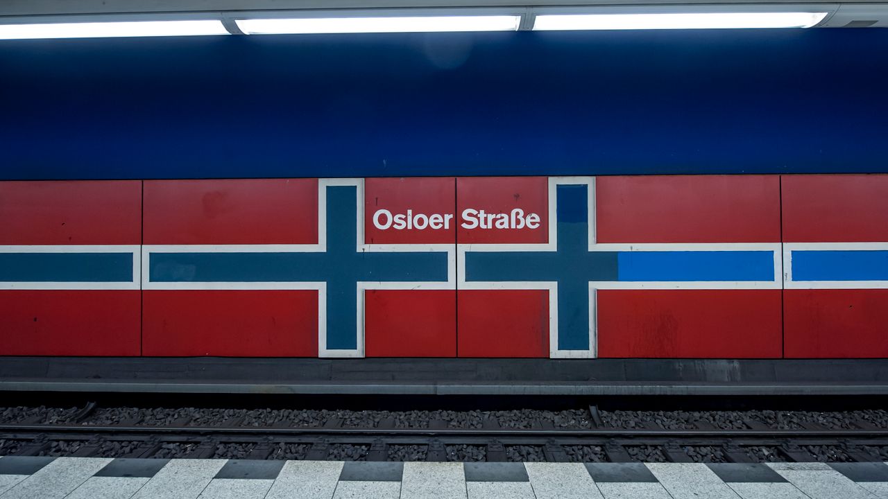 Endstation der Linie U9, Übergang zur Linie U8, viele Gänge und diverse Shops - Wände des U-Bahnhofs in den Farben der norwegischen Fahne