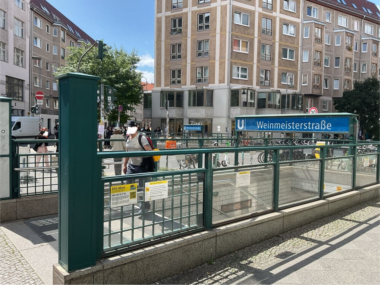 Der U-Bahnhof Weinmeisterstraße liegt in der "Spandauer Vorstadt" im Bezirk Mitte. Umliegende Straßen sind: Alte Schönhauser Straße, Münzstraße, Weinmeister Straße und Rosenthaler Straße.