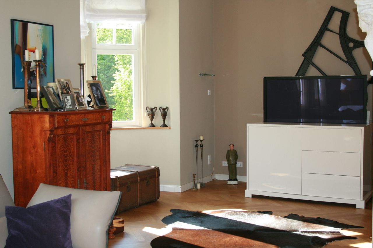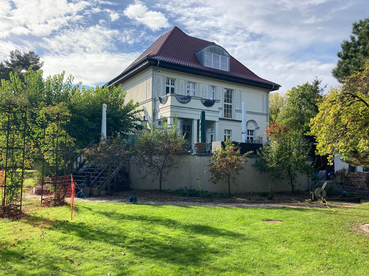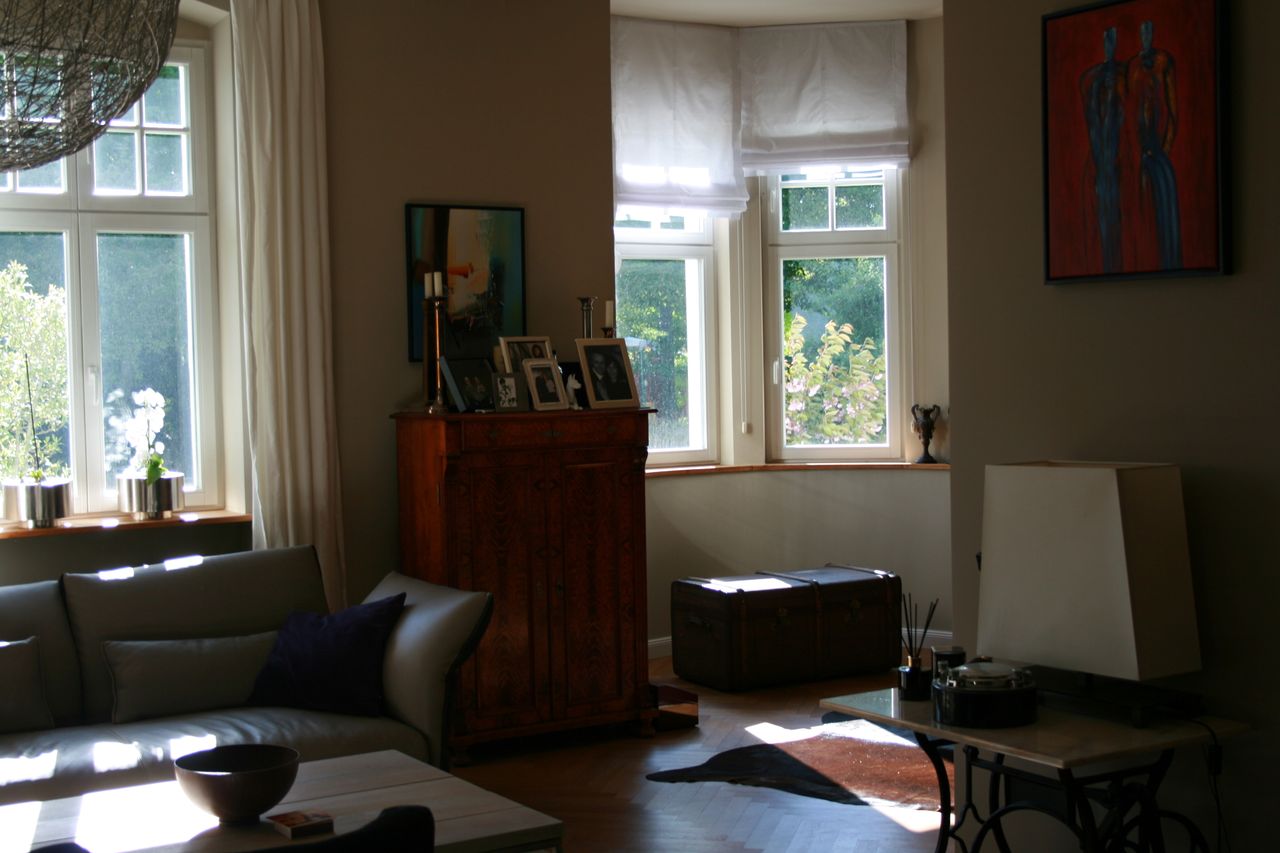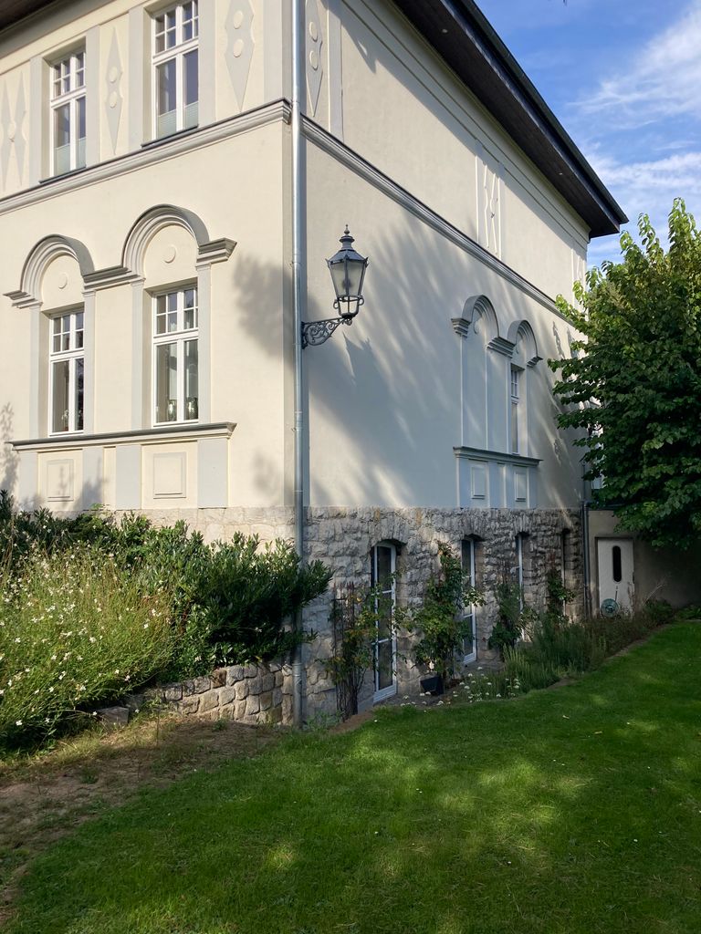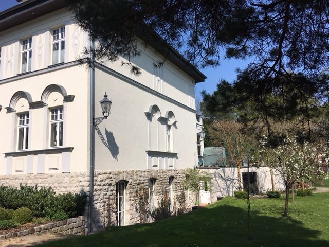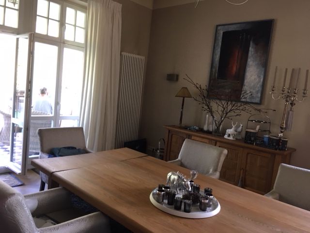 Die Villa wurde mit hohem Standard 2008 modernisiert, verfügt über eine 100 qm große Terrasse, darunter befindet sich die ebenso große Garage, Haupteingang ist im Hochpaterre wie früher üblich. Die Einrichtung ist modern mit alten Möbeln gemischt. Im Erdgeschoss befindet sich ein sehr großes Wohnzimmer und Esszimmer mit original Schiebetüren verbunden, ein Gäste Wc und die Küche. Im OG 2 Schlafzimmer mit Bad ensuite und ein Arbeitszimmer. Das Dachgeschoss ist noch nicht ausgebaut. Das Haus wird von 2 Personen Nichtraucher und Hund bewohnt, im Untergeschoss = Vollgeschoss Höhe 2,50 cm befindet sich ein Büro, ein Hobbyraum eine 2. Küche, Gäste Wc und die noch nicht fertige Sauna die sind mit Parkett und Fliesen ausgestattet.