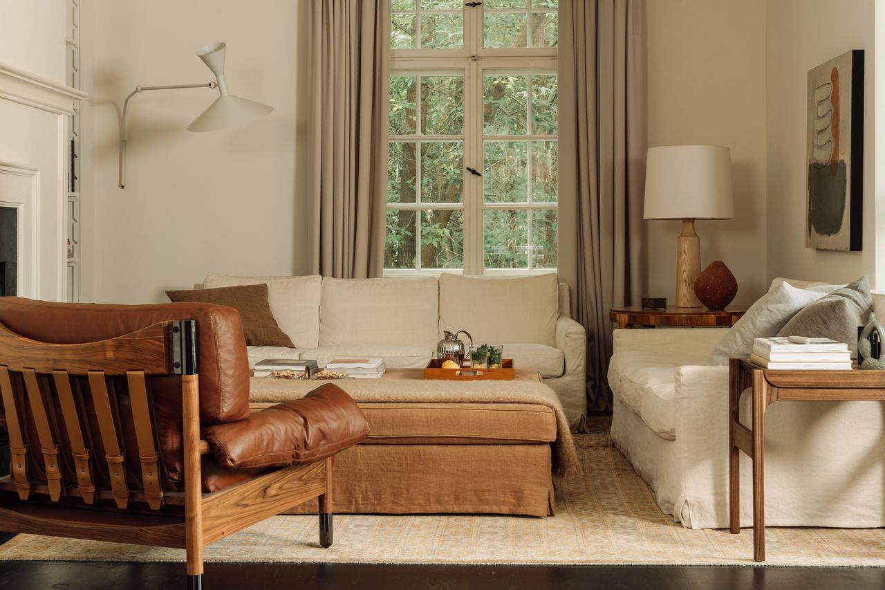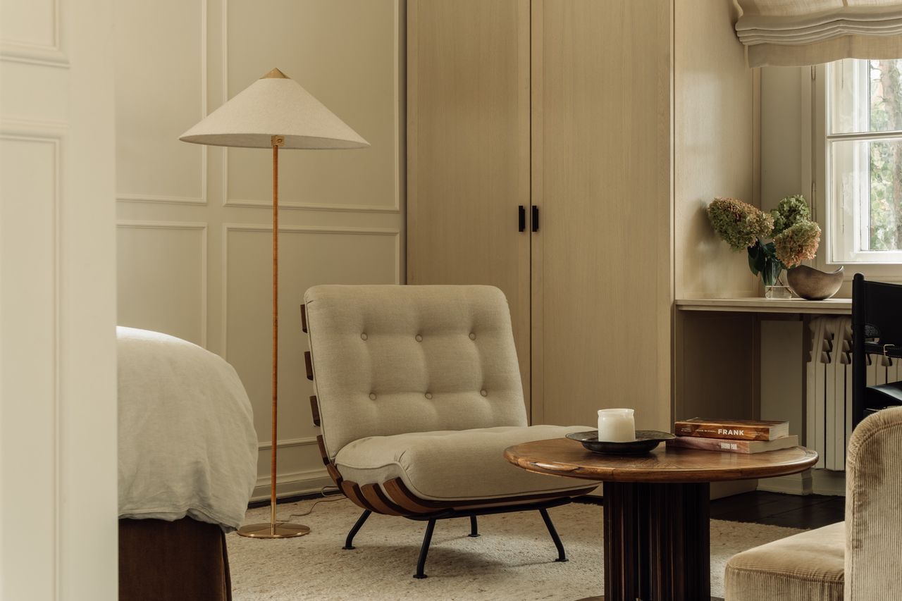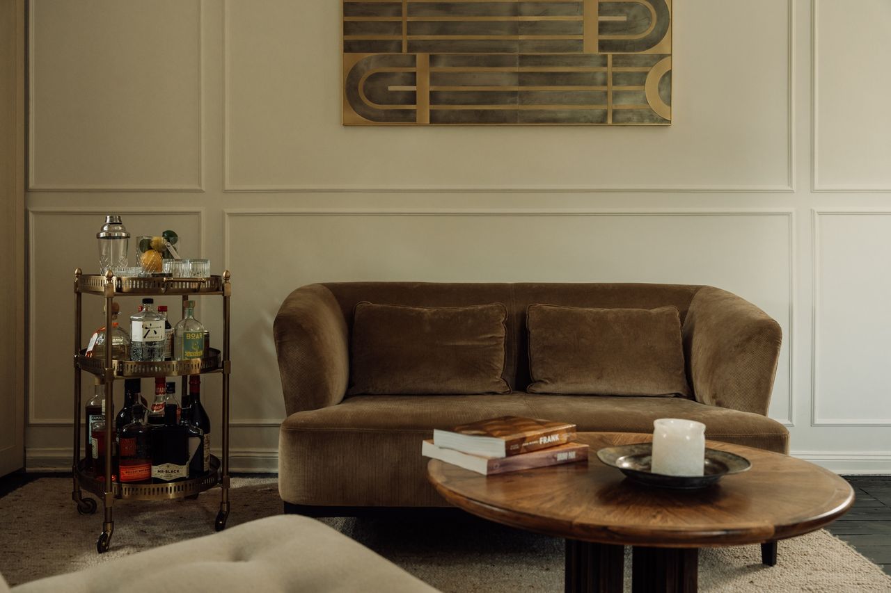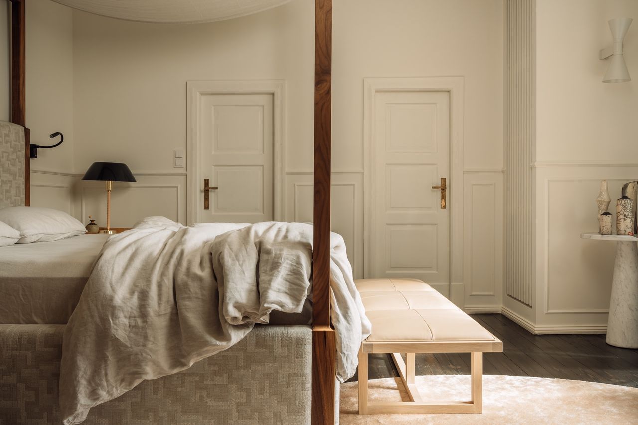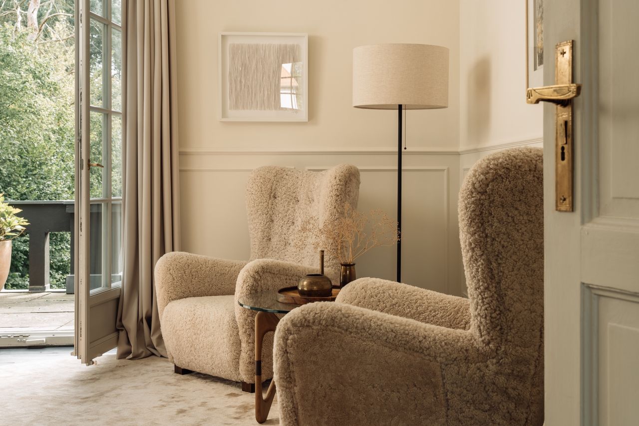 Im Inneren verfügt das Haus über einen mehr als 50 m² großen Wohn- und Essbereich, sechs Schlafzimmer, vier Bäder sowie eine Küche mit semi-professioneller Ausstattung. Auch eine Sauna, ein kleines Fitness-Studio und eine Werkstatt sind vorhanden. Der Eingangsbereich ist im Originalzustand erhalten und wird durch einen Echtholz-Treppenaufgang aus dem Jahr 1925 geprägt. Von hier aus werden alle Räume im Erd-, Ober- und Kellergeschoss erschlossen. Die Raumstruktur ist klar und funktional, ohne Durchgangszimmer, was die Nutzung für Drehs und Shootings erleichtert.