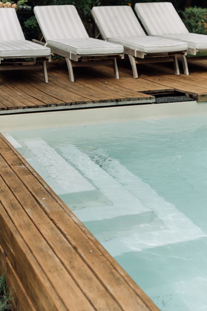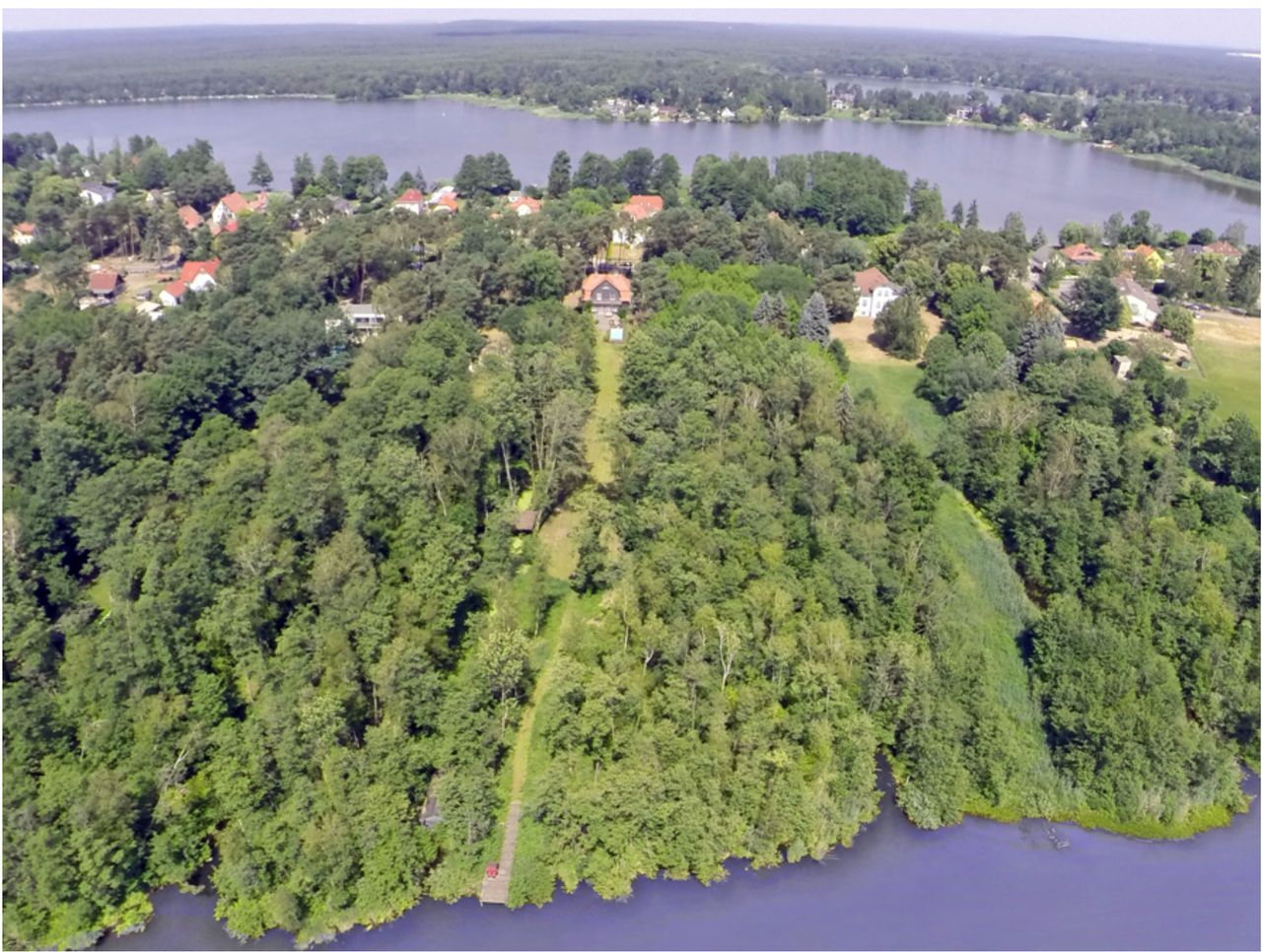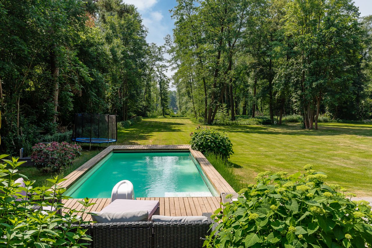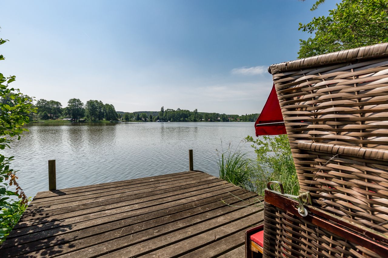 Zum Grundstück gehören neben der Terrasse und dem Pool auch ein Spielplatz, ein Steg mit direktem Seezugang (Seegrundstück) sowie ein altes Bootshaus. Die Außenflächen bieten verschiedene Blickachsen und naturnahe Motive.