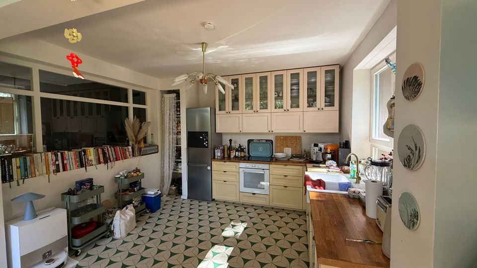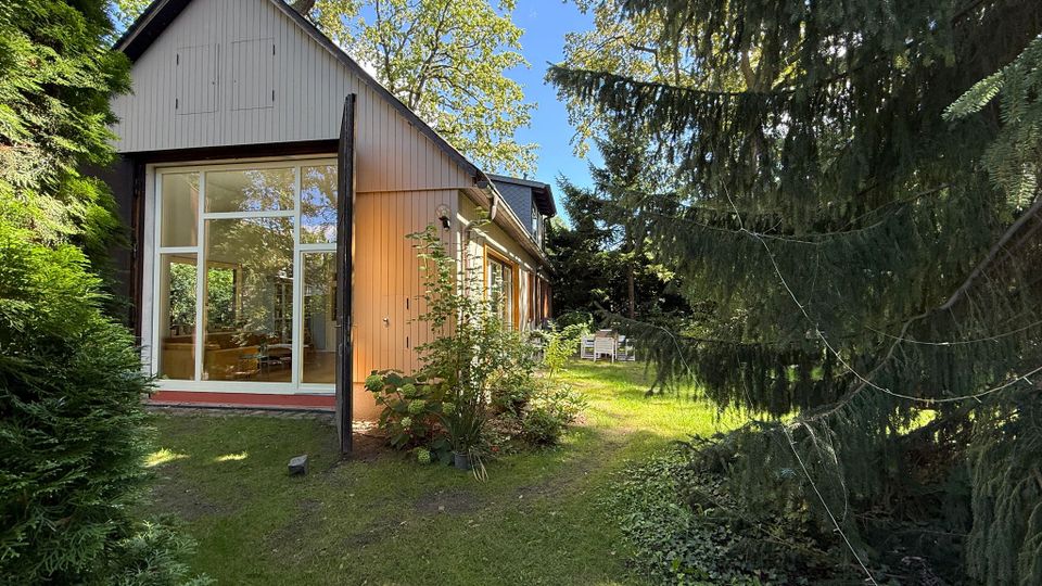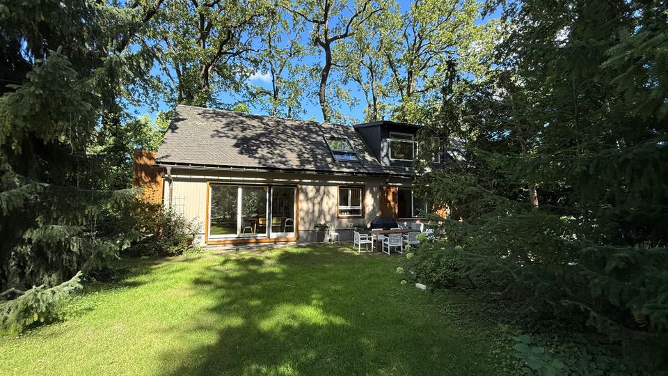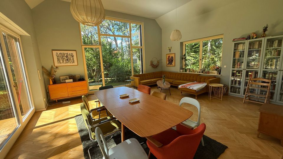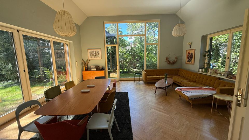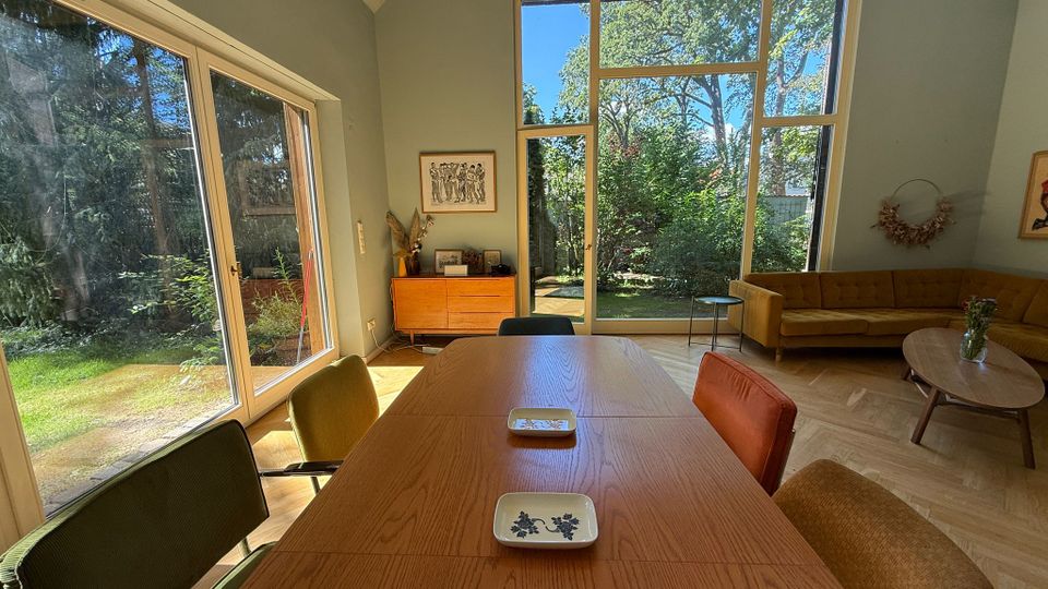 Lichtdurchflutetes Einfamilienhaus mit Satteldach, heller Gaube und umlaufendem, eingewachsenem Garten. Das Herzstück ist ein großzügiger Wohn-/Essbereich mit sehr hoher Decke und einer raumhohen Fensterfront zum Grün – ideal für Daylight-Drehs, Familien-Szenen, Werbe- und Interior-Shootings. Mid-Century-/ BauhausMobiliar, Eichen-Fischgrätparkett und sanfte Wandfarben erzeugen eine warme, skandinavische Atmosphäre. Highlights Riesige Fensterfronten zum Garten, mehrere Schiebe-/Terrassentüren Sehr hohe Decken (Kathedraldecke) im Wohnraum, zusätzliche Dachgaube Authentisches Mid-Century-Setting: Ecksofa in Senfton, Design-Stühle, Sideboards, Vitrinen, Bücherwand Heller Eichenparkettboden im Fischgrätmuster Umlaufender, blickgeschützter Garten mit alten Bäumen, Rasenflächen und Terrasse Grundrisse/Schnitte vorhanden (EG & DG) – klare Achsen und gute Stell- und Riggingmöglichkeiten Räume & Motive Wohn-/Essbereich: Offener, sehr weiter Raum mit großem Esstisch, Lounge-Ecke, Coffeetable; mehrere Blickachsen in den Garten. Küche: Separat gelegen, anschließbar an den Flur und den Wohnbereich. Schlaf-/Arbeitszimmer: Mehrere Zimmer auf EG und DG (siehe Pläne), neutrale, wohnliche Optik. Bäder: Tageslichtbad im Dachgeschoss (Wanne), weiter(es) Bad im Erdgeschoss. Flure/Treppenhaus: Geradlinige Wegeführung, Holz und Weißtöne. Dach & Fassade: Satteldach mit großem, modernem Zwerchgiebel, Holzverschalung – charmante Außenmotive. Außenbereich Große Rasenflächen, Terrassenbereiche und natürliche Schattenzonen durch hohe Bäume Ruhige, grüne Umgebung; Haus liegt gut eingebettet im Garten – Privatheit für Team & Cast Licht & Akustik Weiches, gefiltertes Tageslicht durch die Bäume; durch die bodentiefen Fenster ganztägig sehr gute, gleichmäßige Ausleuchtung Ruhige Lage, angenehme Raumakustik (Vorhänge, Polstermöbel, Bücherregale) Logistik Direkter ebenerdiger Zugang zum Wohnraum über die Terrassentüren – ideal für Equipment und Möbelfahrten Ausreichend Stellflächen im Garten für Technik, Maske/Styling und Basecamp (nach Absprache) Mobiliar kann – schonend – nach Absprache umgestellt werden. Strom über Haushaltsanschlüsse; zusätzliche Absicherung nach Bedarf möglich. Looks & Genres Familienidylle, skandinavisches Design, Künstlerhaus/Atelier-Vibe, 60s/70s-Reminiszenz, Natur-Rückzugsort, stilvolle Werbemotive (Home, Food, Interior, Lifestyle). Hinweise Bitte Begehung/Tech Recce vorab. Schutz von Parkett und Gartenflächen (Boden-/Rasenschutz) erwünscht. Haus regennass- und nächtetauglich; Nachtstimmungen lassen sich durch die große Fensterfront wirkungsvoll inszenieren.