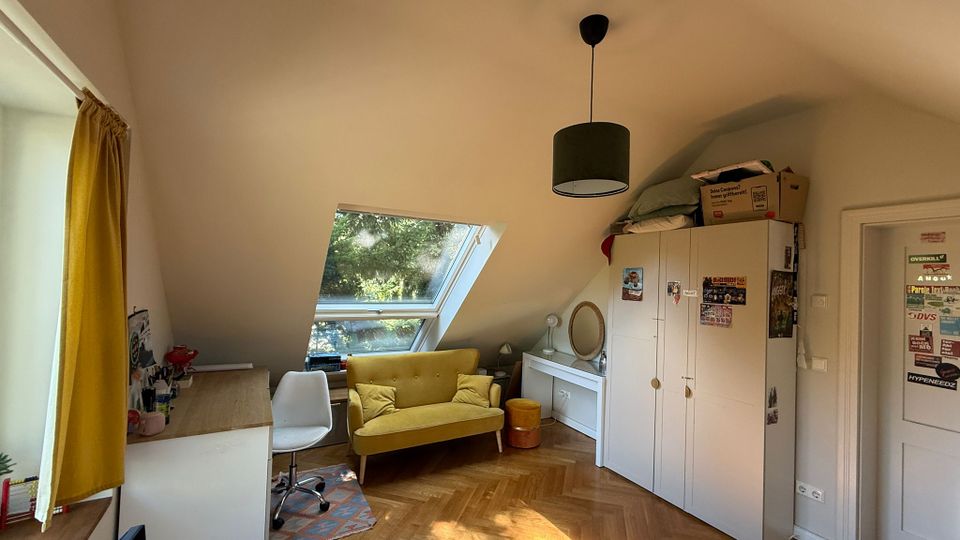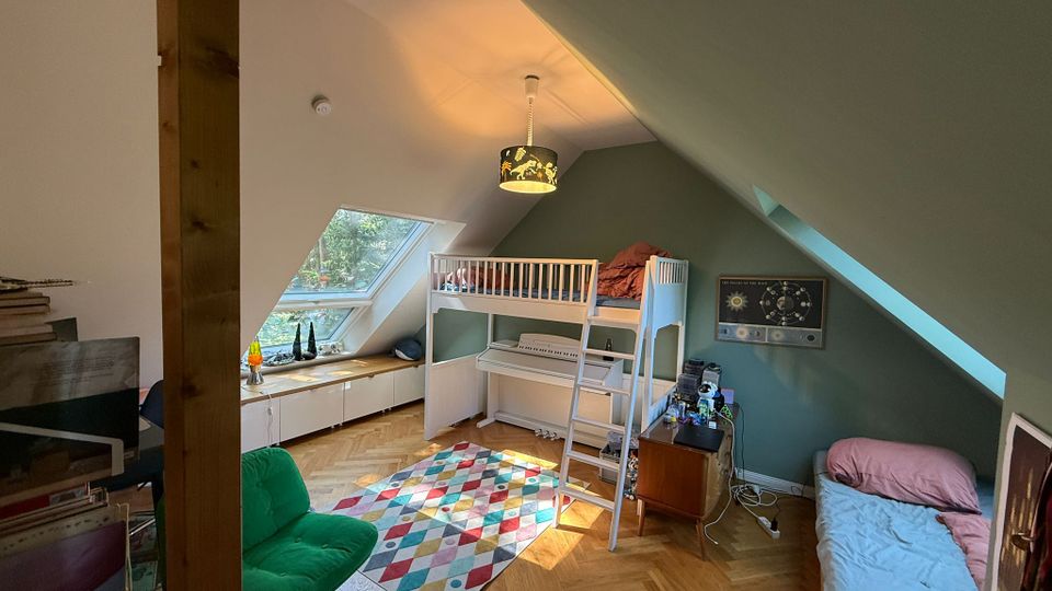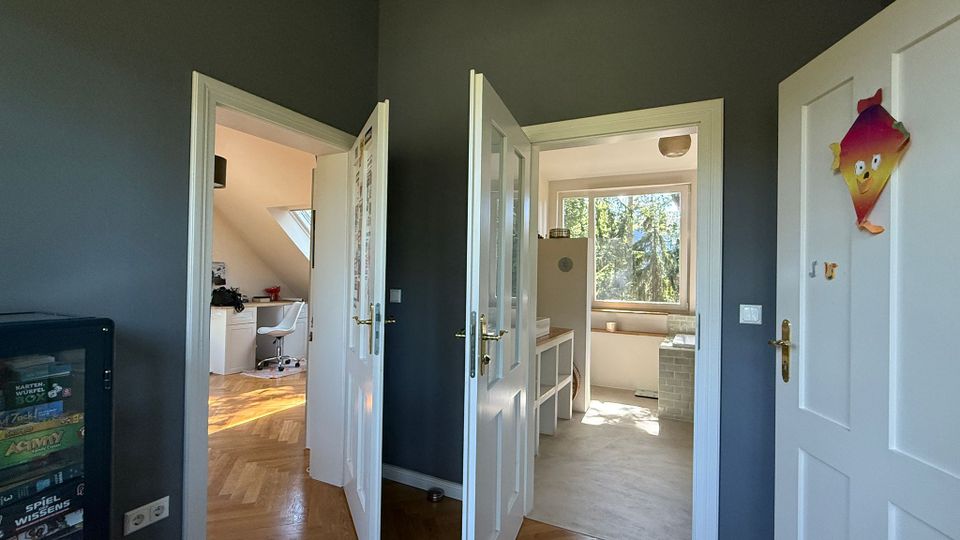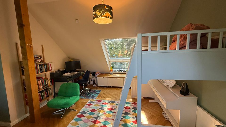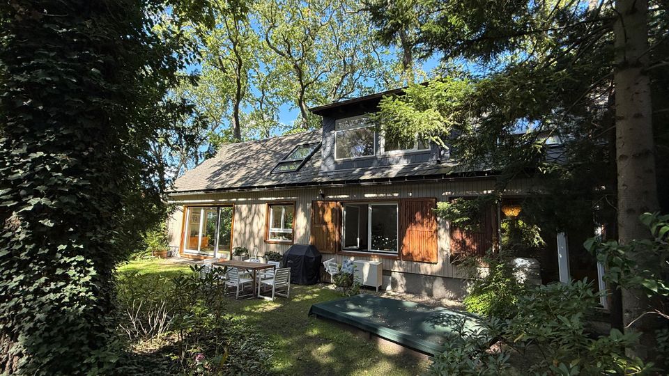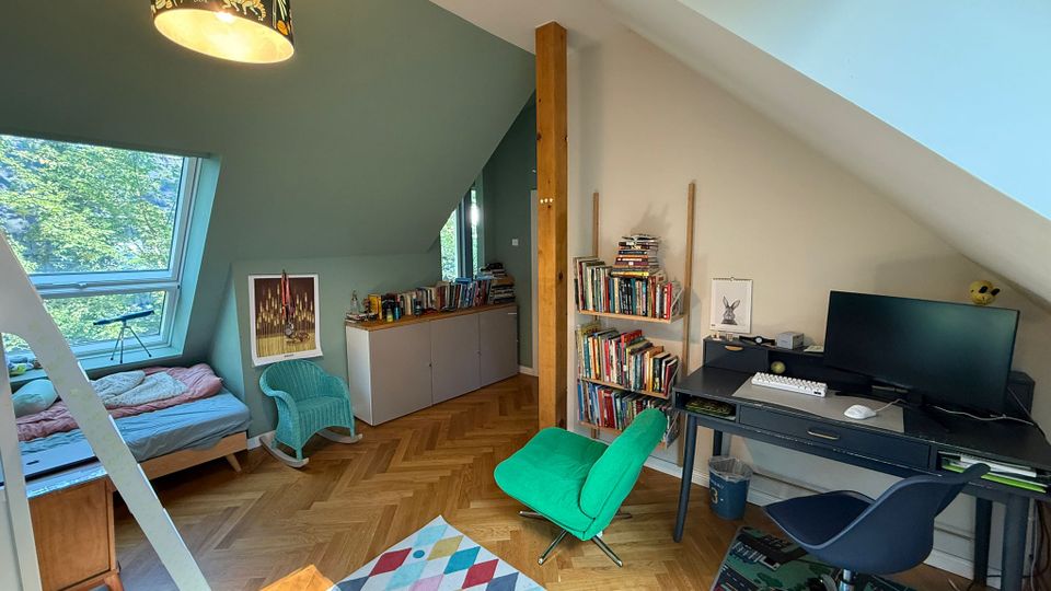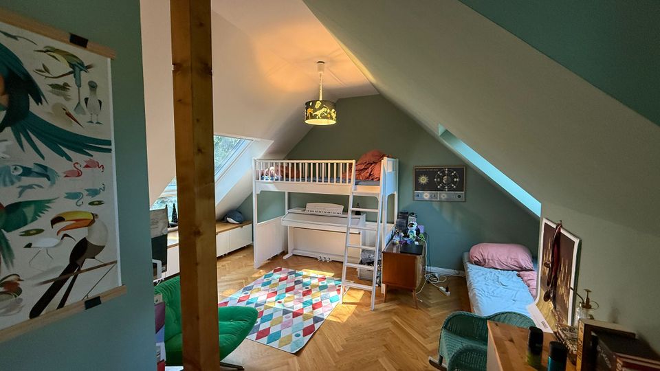 Lichtdurchflutetes Einfamilienhaus mit Satteldach, heller Gaube und umlaufendem, eingewachsenem Garten. Das Herzstück ist ein großzügiger Wohn-/Essbereich mit sehr hoher Decke und einer raumhohen Fensterfront zum Grün – ideal für Daylight-Drehs, Familien-Szenen, Werbe- und Interior-Shootings. Mid-Century-/ BauhausMobiliar, Eichen-Fischgrätparkett und sanfte Wandfarben erzeugen eine warme, skandinavische Atmosphäre. Highlights Riesige Fensterfronten zum Garten, mehrere Schiebe-/Terrassentüren Sehr hohe Decken (Kathedraldecke) im Wohnraum, zusätzliche Dachgaube Authentisches Mid-Century-Setting: Ecksofa in Senfton, Design-Stühle, Sideboards, Vitrinen, Bücherwand Heller Eichenparkettboden im Fischgrätmuster Umlaufender, blickgeschützter Garten mit alten Bäumen, Rasenflächen und Terrasse Grundrisse/Schnitte vorhanden (EG & DG) – klare Achsen und gute Stell- und Riggingmöglichkeiten Räume & Motive Wohn-/Essbereich: Offener, sehr weiter Raum mit großem Esstisch, Lounge-Ecke, Coffeetable; mehrere Blickachsen in den Garten. Küche: Separat gelegen, anschließbar an den Flur und den Wohnbereich. Schlaf-/Arbeitszimmer: Mehrere Zimmer auf EG und DG (siehe Pläne), neutrale, wohnliche Optik. Bäder: Tageslichtbad im Dachgeschoss (Wanne), weiter(es) Bad im Erdgeschoss. Flure/Treppenhaus: Geradlinige Wegeführung, Holz und Weißtöne. Dach & Fassade: Satteldach mit großem, modernem Zwerchgiebel, Holzverschalung – charmante Außenmotive. Außenbereich Große Rasenflächen, Terrassenbereiche und natürliche Schattenzonen durch hohe Bäume Ruhige, grüne Umgebung; Haus liegt gut eingebettet im Garten – Privatheit für Team & Cast Licht & Akustik Weiches, gefiltertes Tageslicht durch die Bäume; durch die bodentiefen Fenster ganztägig sehr gute, gleichmäßige Ausleuchtung Ruhige Lage, angenehme Raumakustik (Vorhänge, Polstermöbel, Bücherregale) Logistik Direkter ebenerdiger Zugang zum Wohnraum über die Terrassentüren – ideal für Equipment und Möbelfahrten Ausreichend Stellflächen im Garten für Technik, Maske/Styling und Basecamp (nach Absprache) Mobiliar kann – schonend – nach Absprache umgestellt werden. Strom über Haushaltsanschlüsse; zusätzliche Absicherung nach Bedarf möglich. Looks & Genres Familienidylle, skandinavisches Design, Künstlerhaus/Atelier-Vibe, 60s/70s-Reminiszenz, Natur-Rückzugsort, stilvolle Werbemotive (Home, Food, Interior, Lifestyle). Hinweise Bitte Begehung/Tech Recce vorab. Schutz von Parkett und Gartenflächen (Boden-/Rasenschutz) erwünscht. Haus regennass- und nächtetauglich; Nachtstimmungen lassen sich durch die große Fensterfront wirkungsvoll inszenieren.