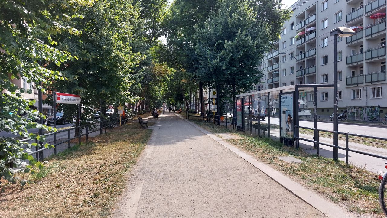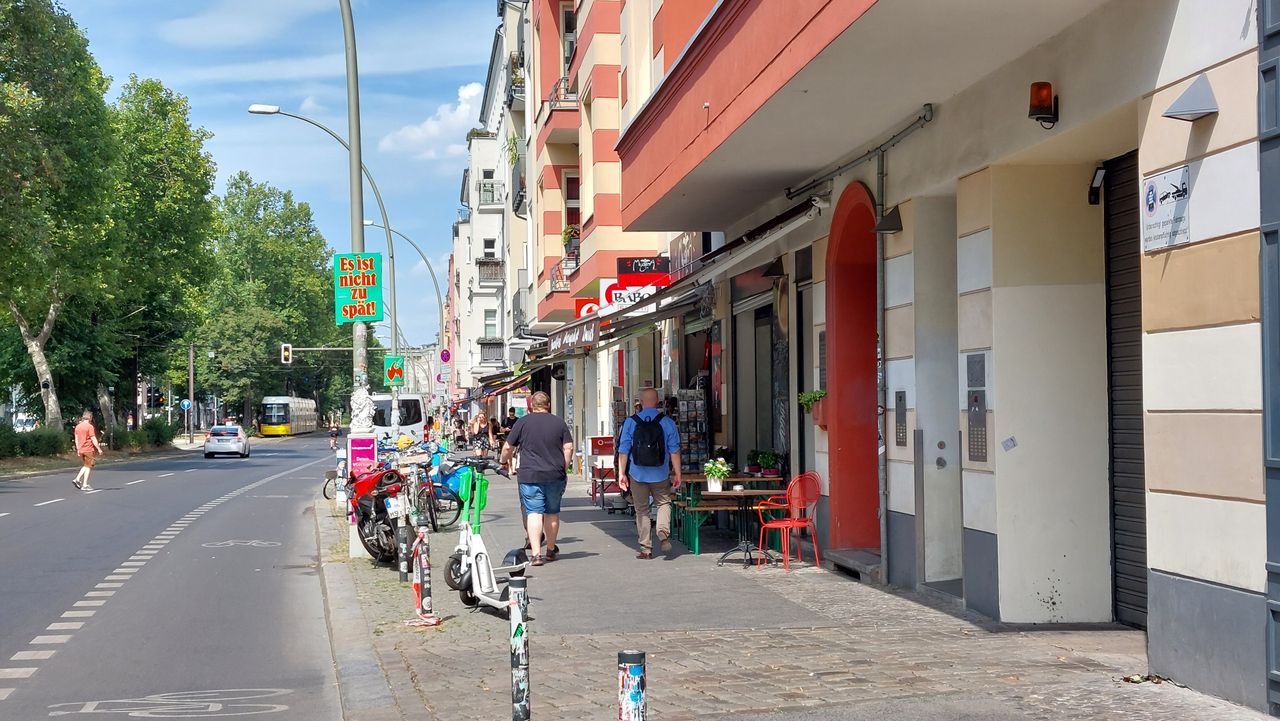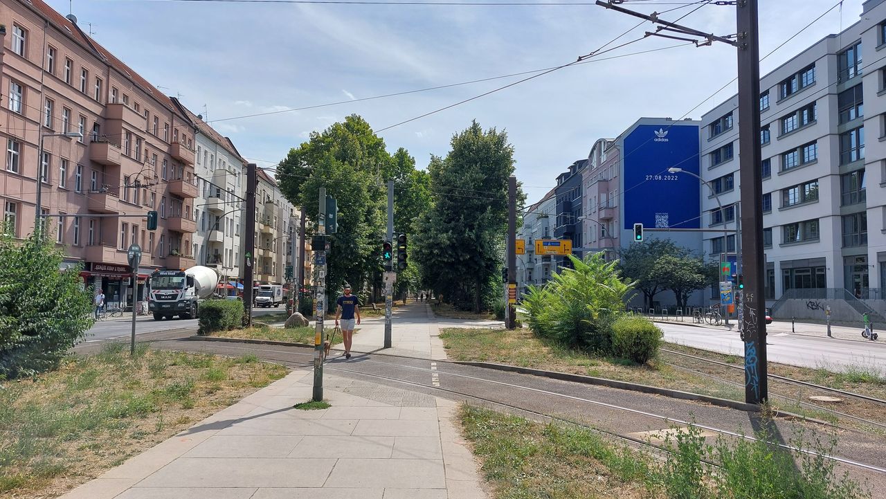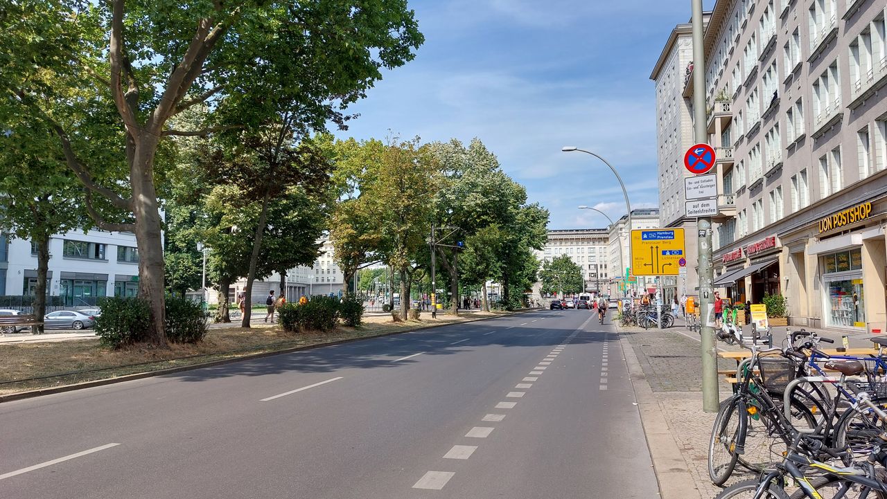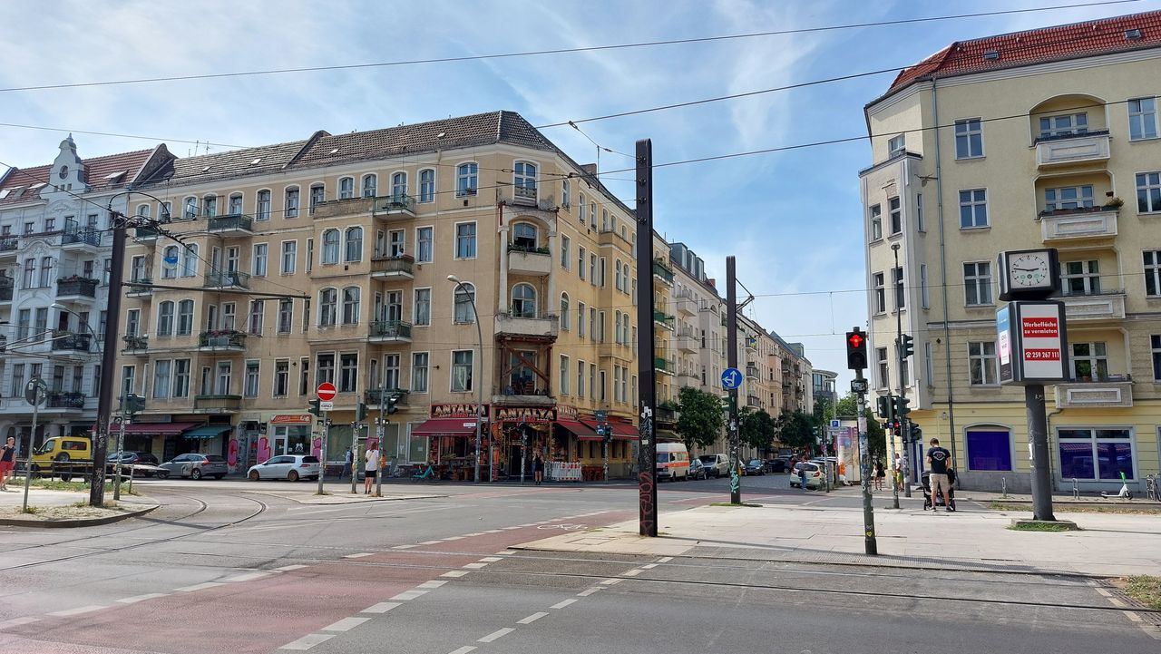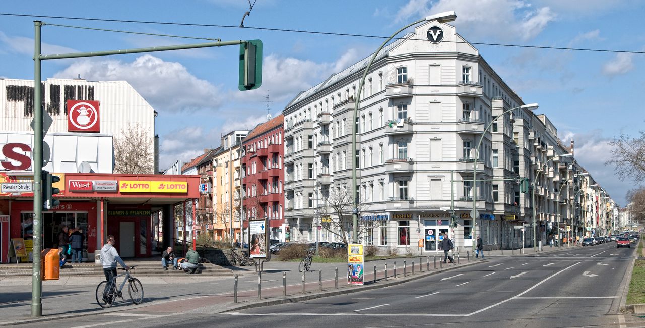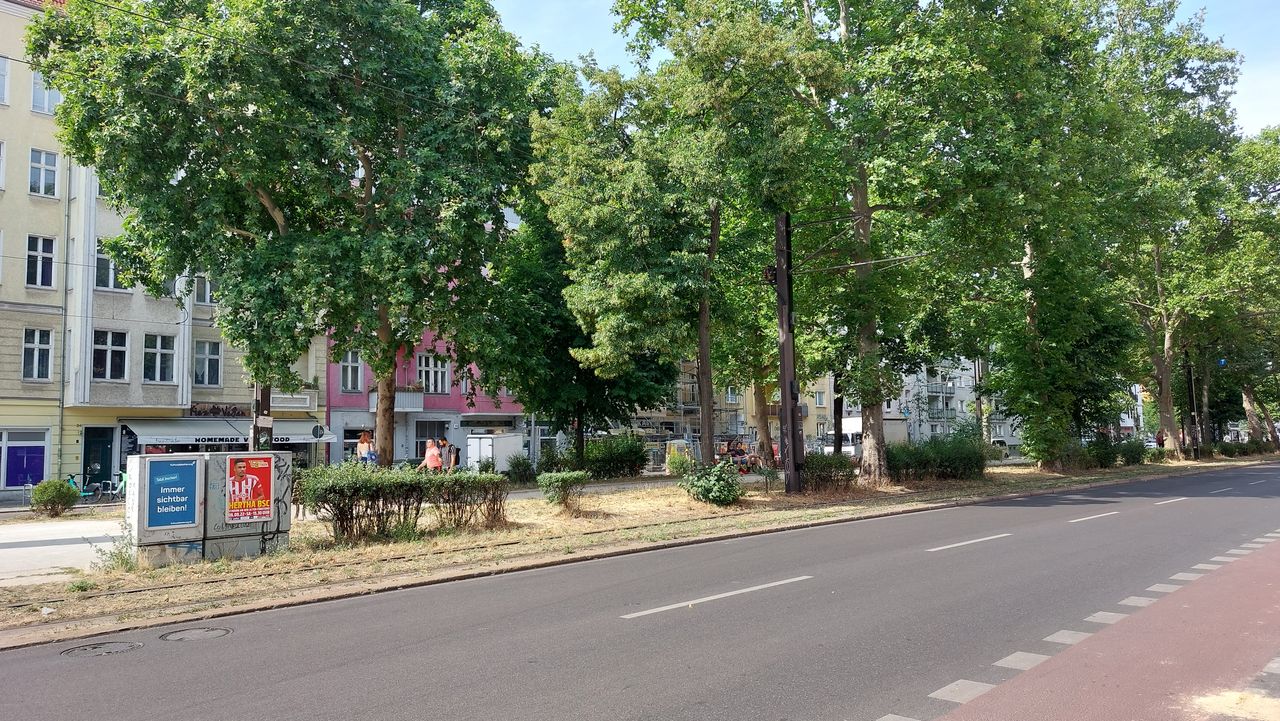Sehr stark befahrene Straße in Ost-Berlin. Zweispurig mit einer Straßenbahnlinie auf dem Mittelstück. Die Straße ist sehr belebt mit Lebensmittelgeschäften, Cafés und Imbissen.