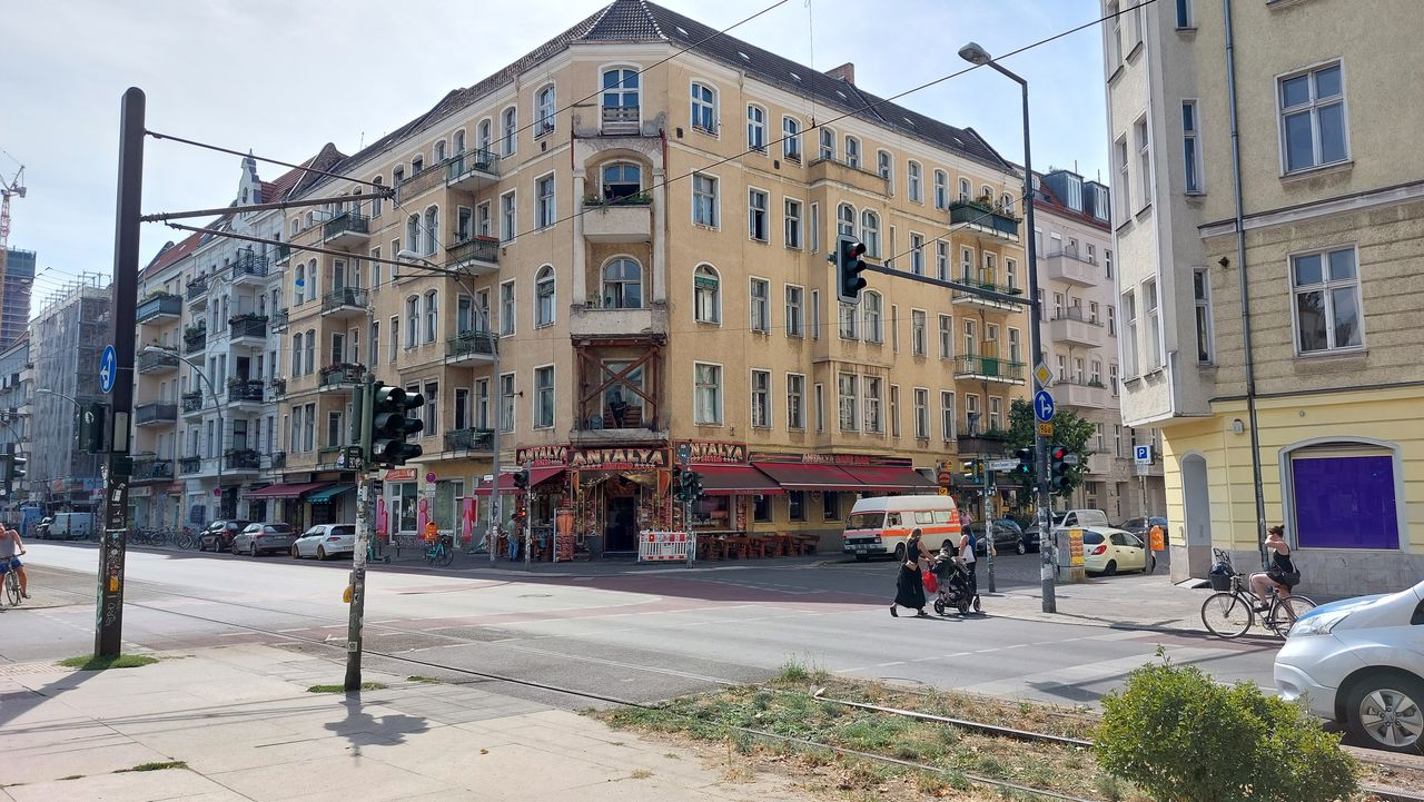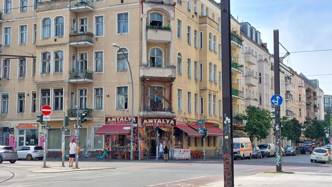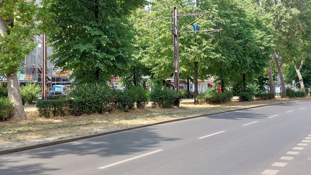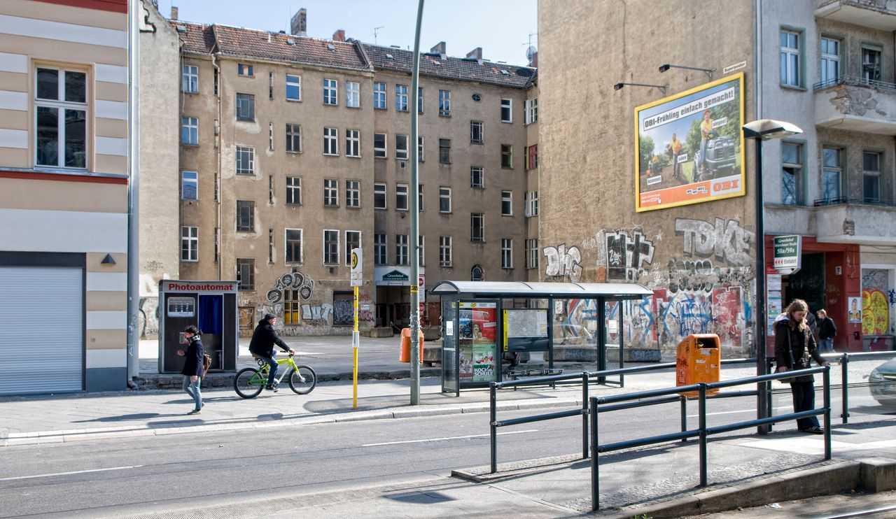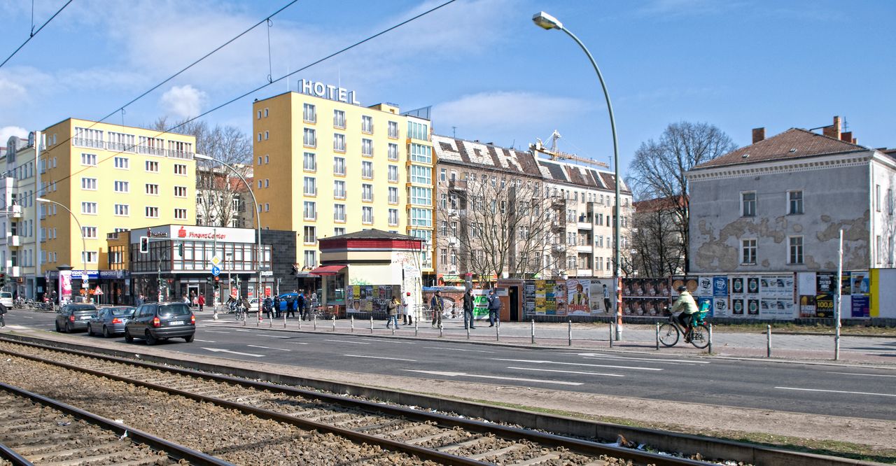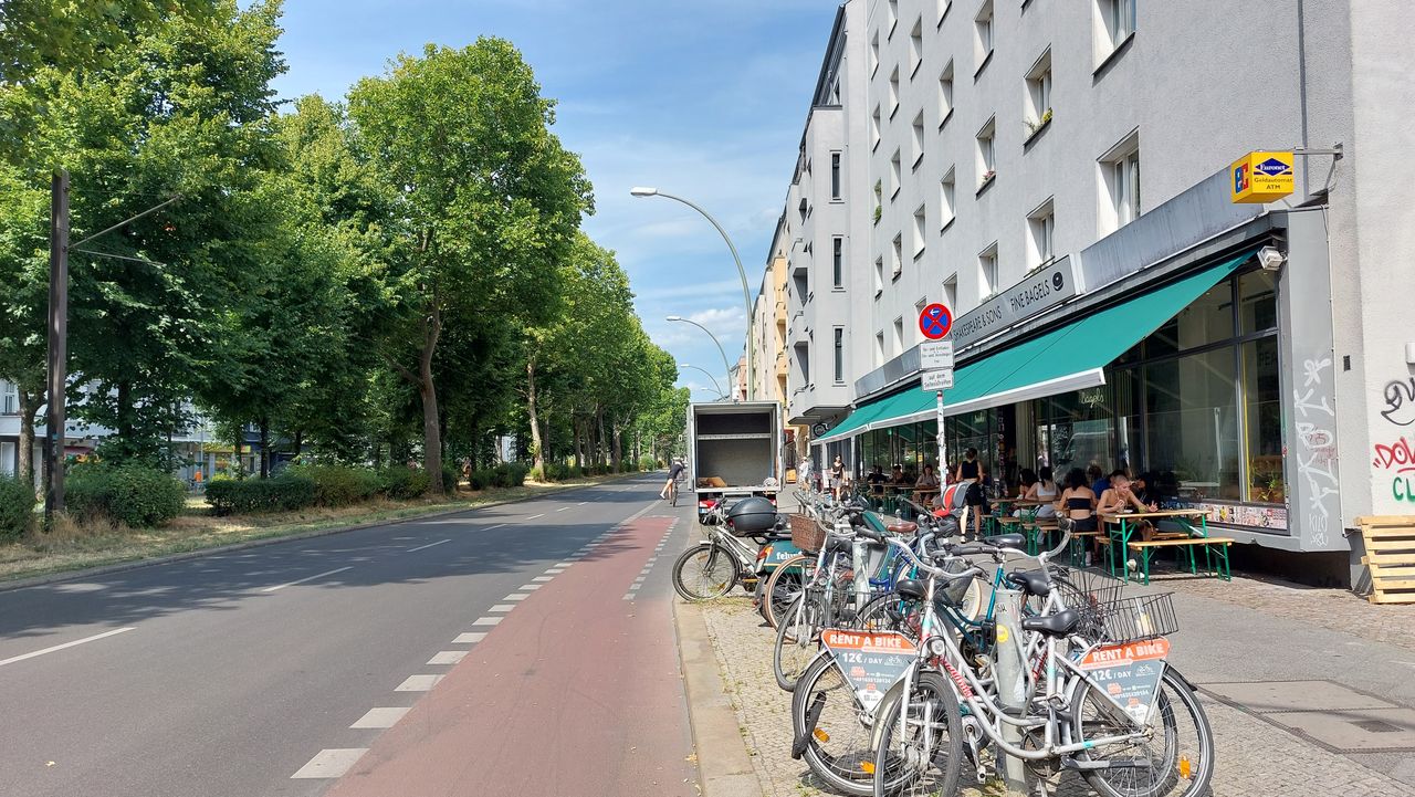 Sehr stark befahrene Straße in Ost-Berlin. Zweispurig mit einer Straßenbahnlinie auf dem Mittelstück. Die Straße ist sehr belebt mit Lebensmittelgeschäften, Cafés und Imbissen.