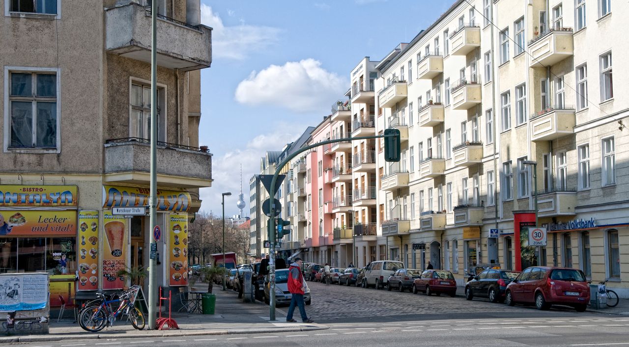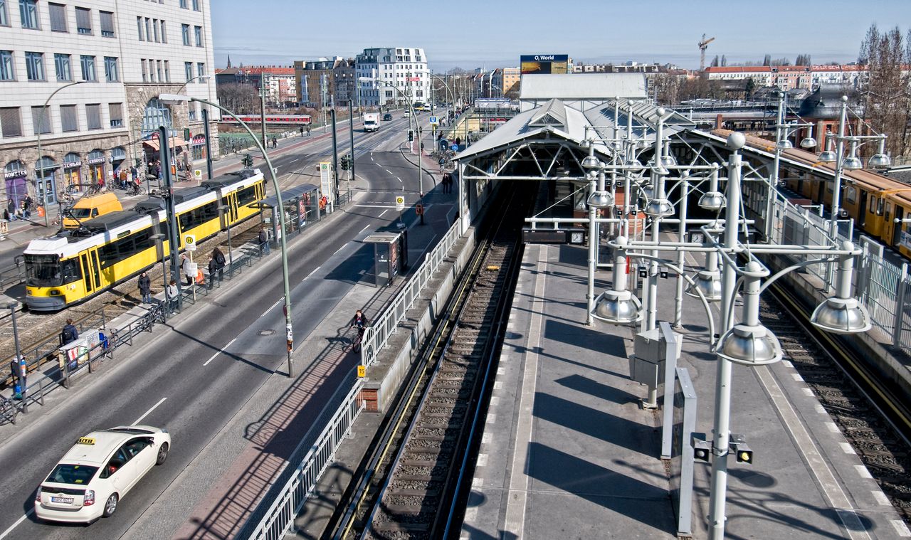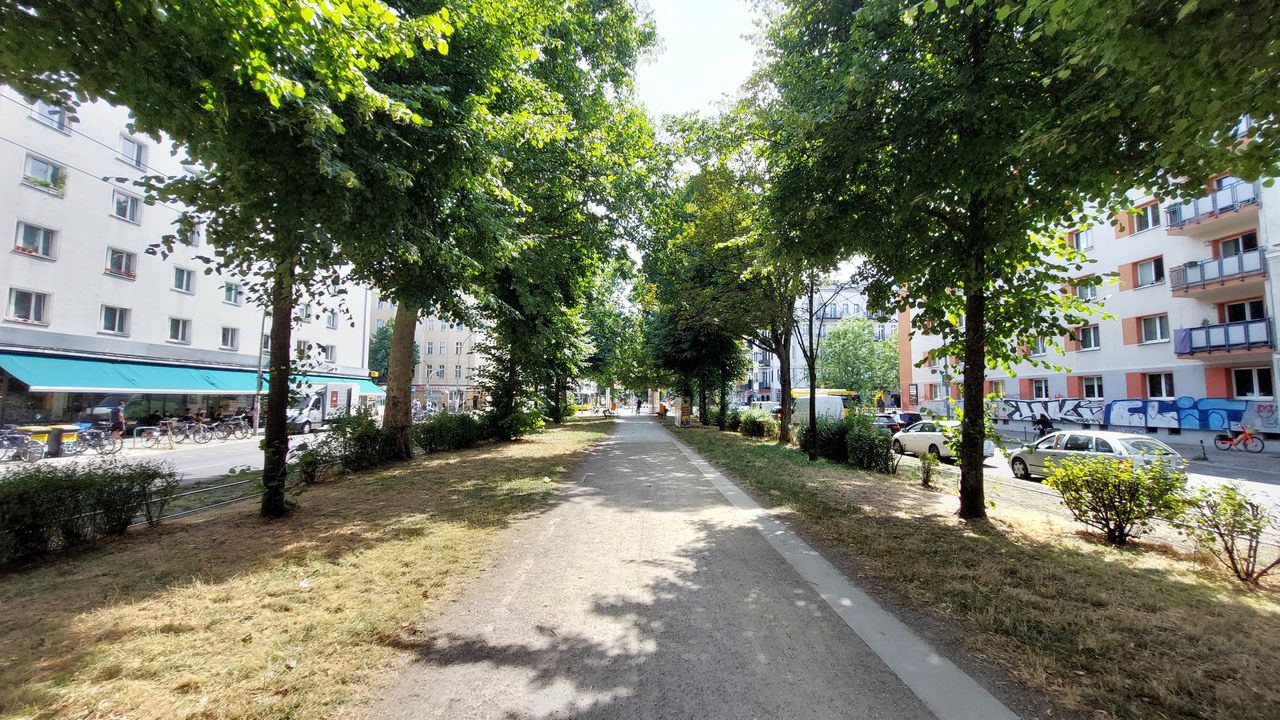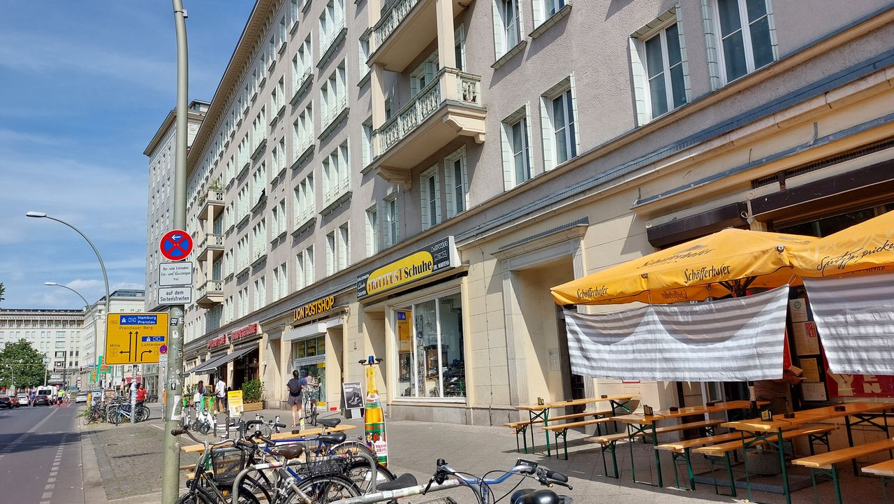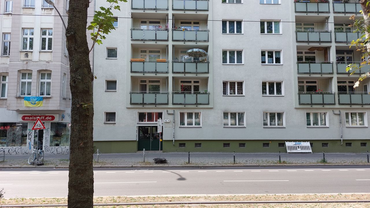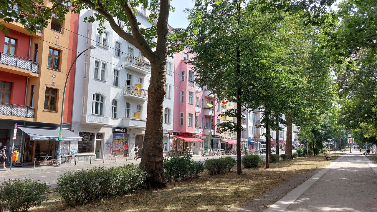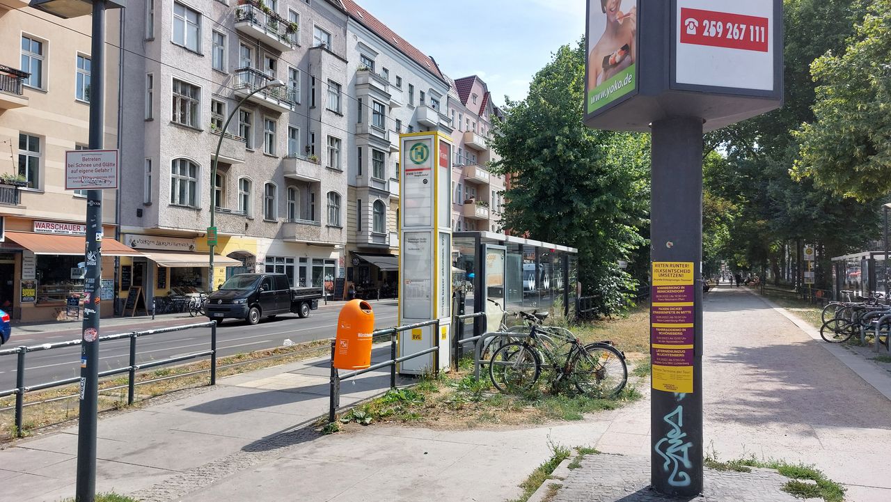 Sehr stark befahrene Straße in Ost-Berlin. Zweispurig mit einer Straßenbahnlinie auf dem Mittelstück. Die Straße ist sehr belebt mit Lebensmittelgeschäften, Cafés und Imbissen.
