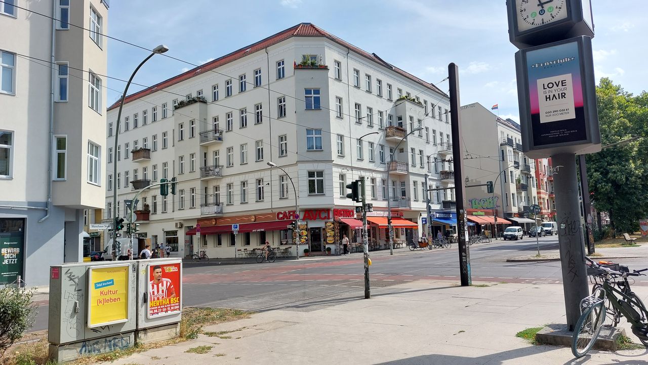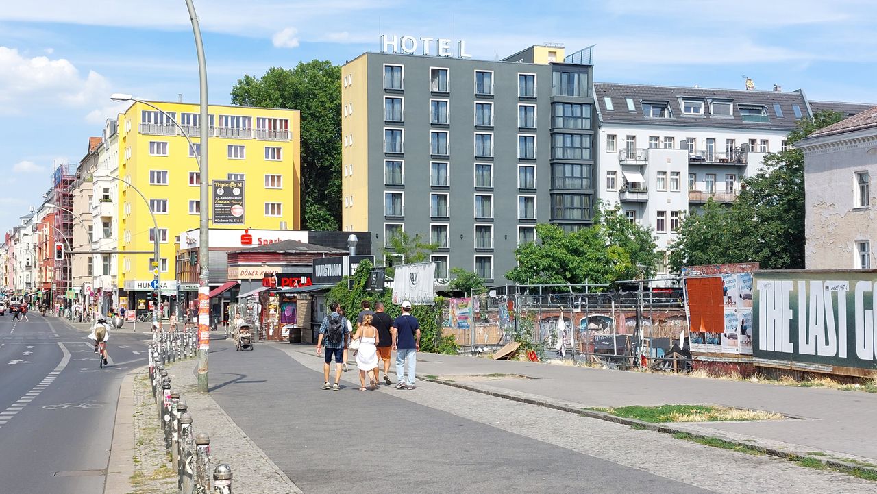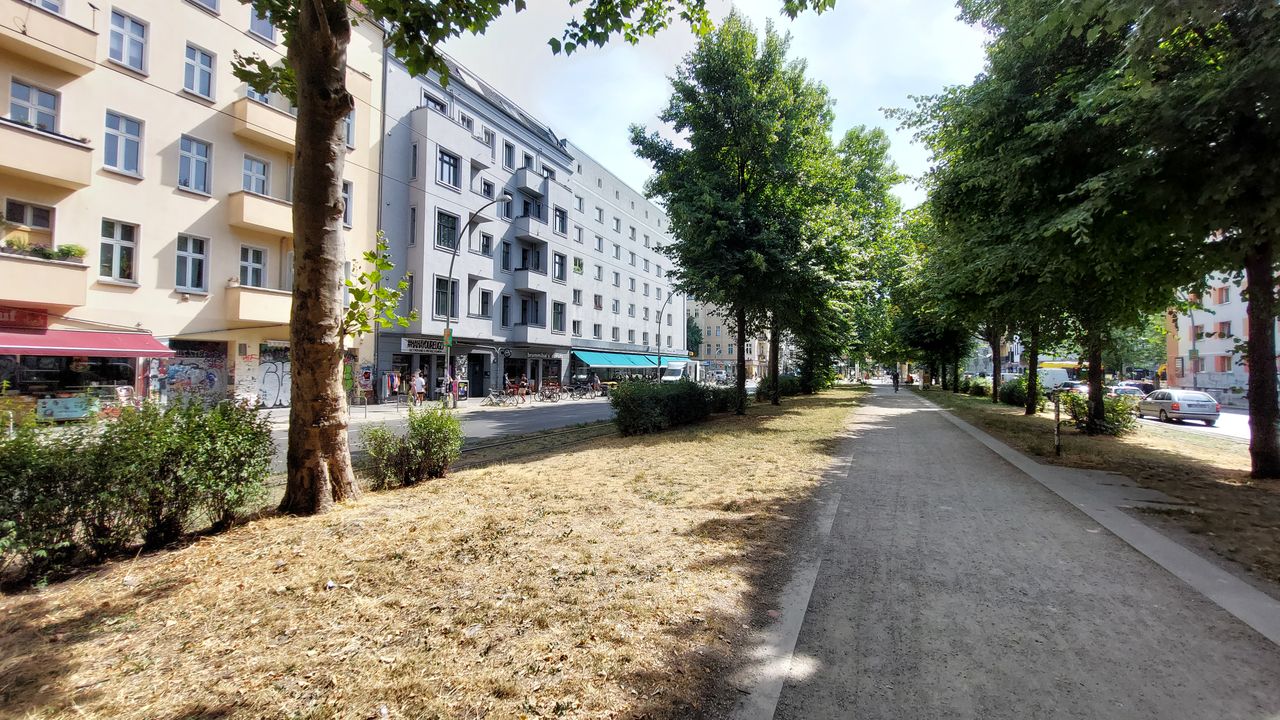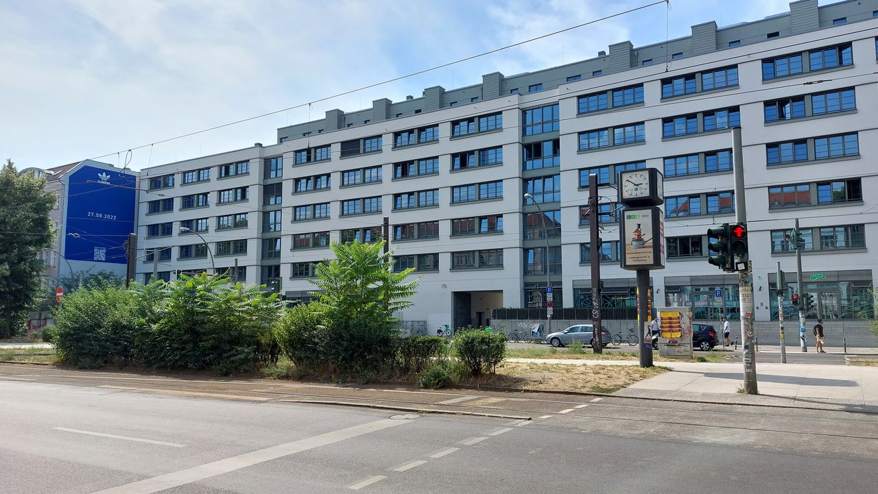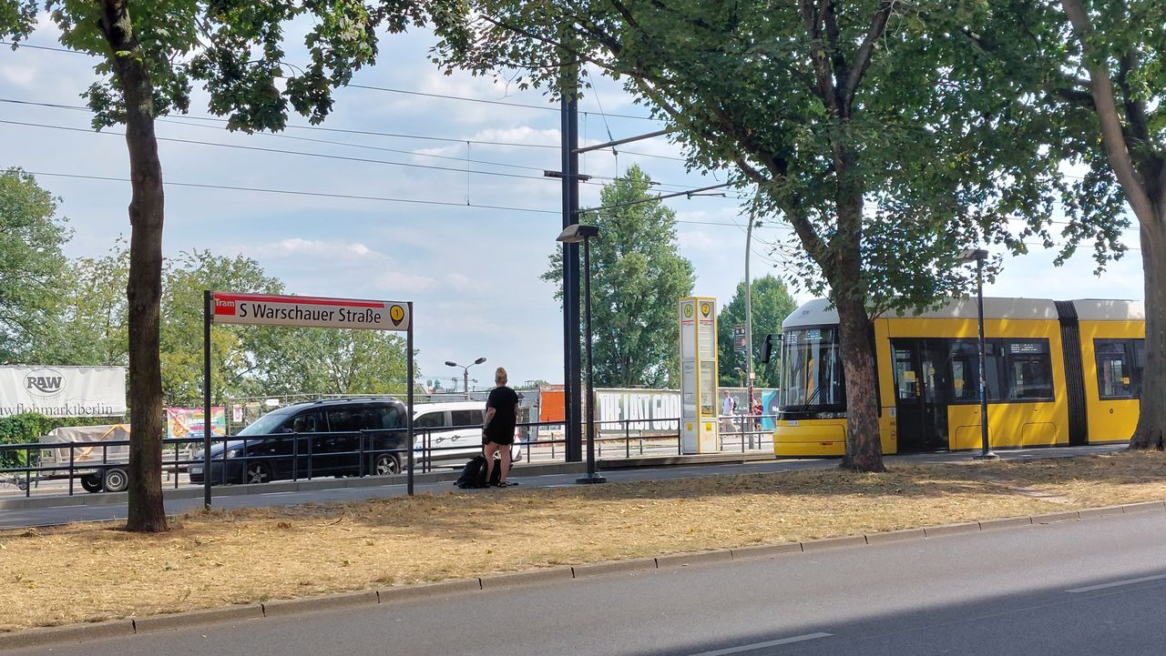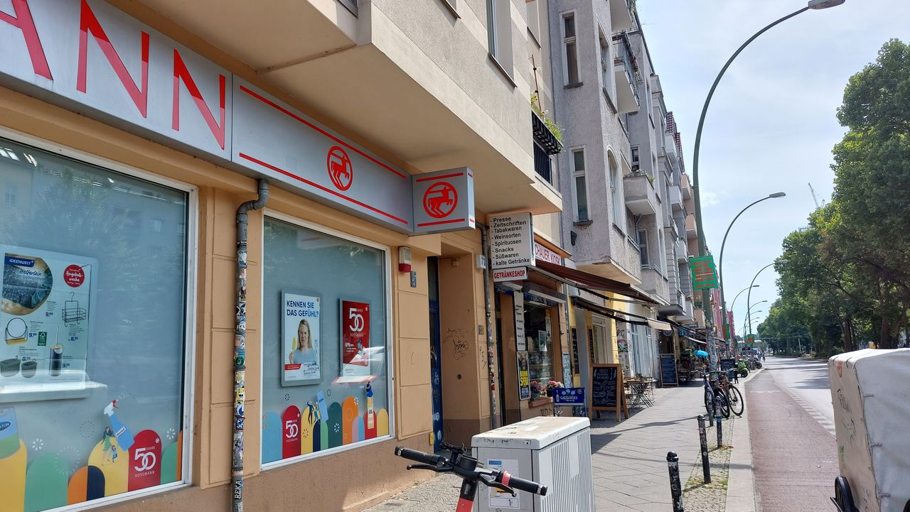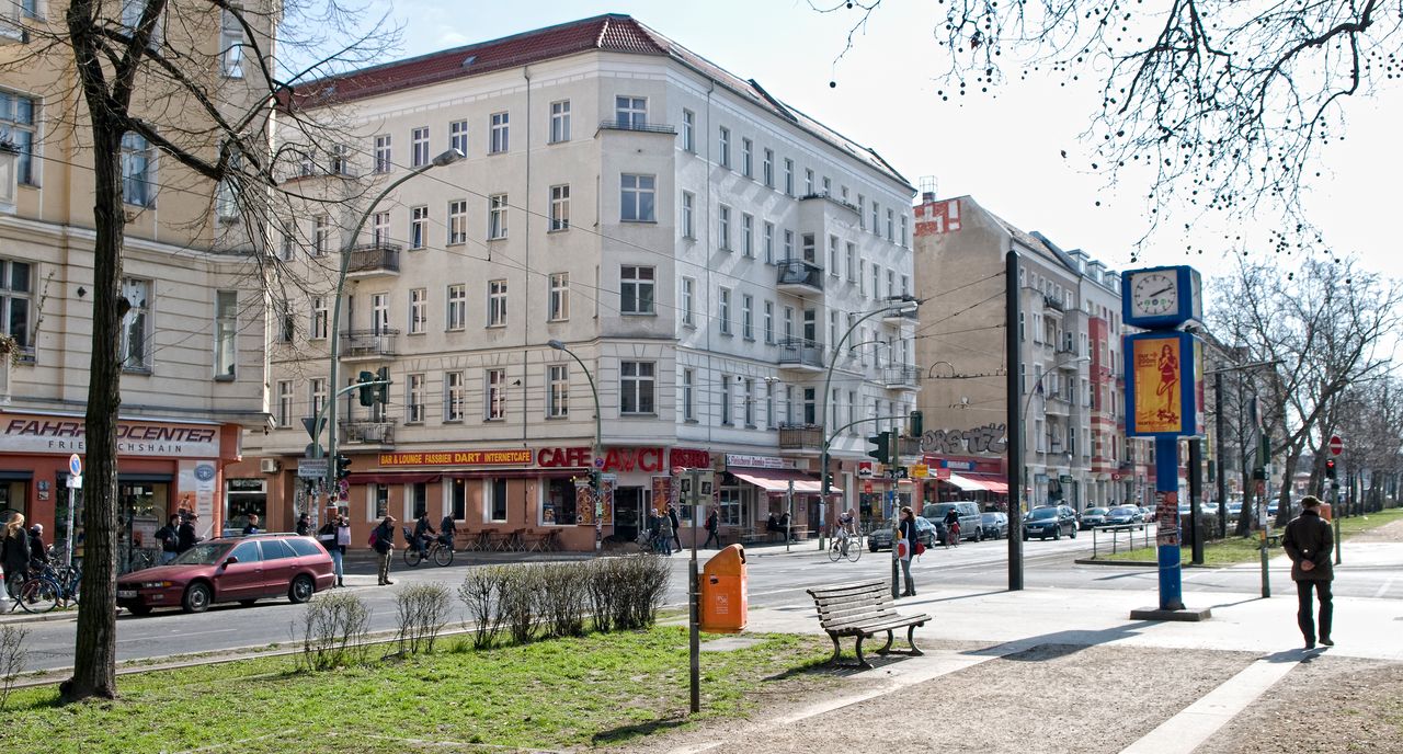 Sehr stark befahrene Straße in Ost-Berlin. Zweispurig mit einer Straßenbahnlinie auf dem Mittelstück. Die Straße ist sehr belebt mit Lebensmittelgeschäften, Cafés und Imbissen.