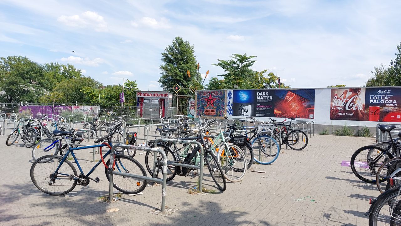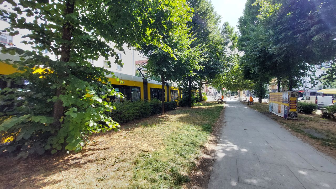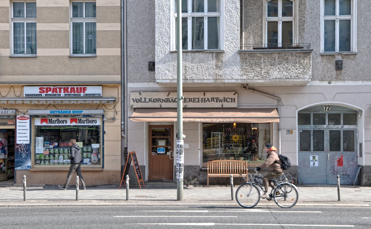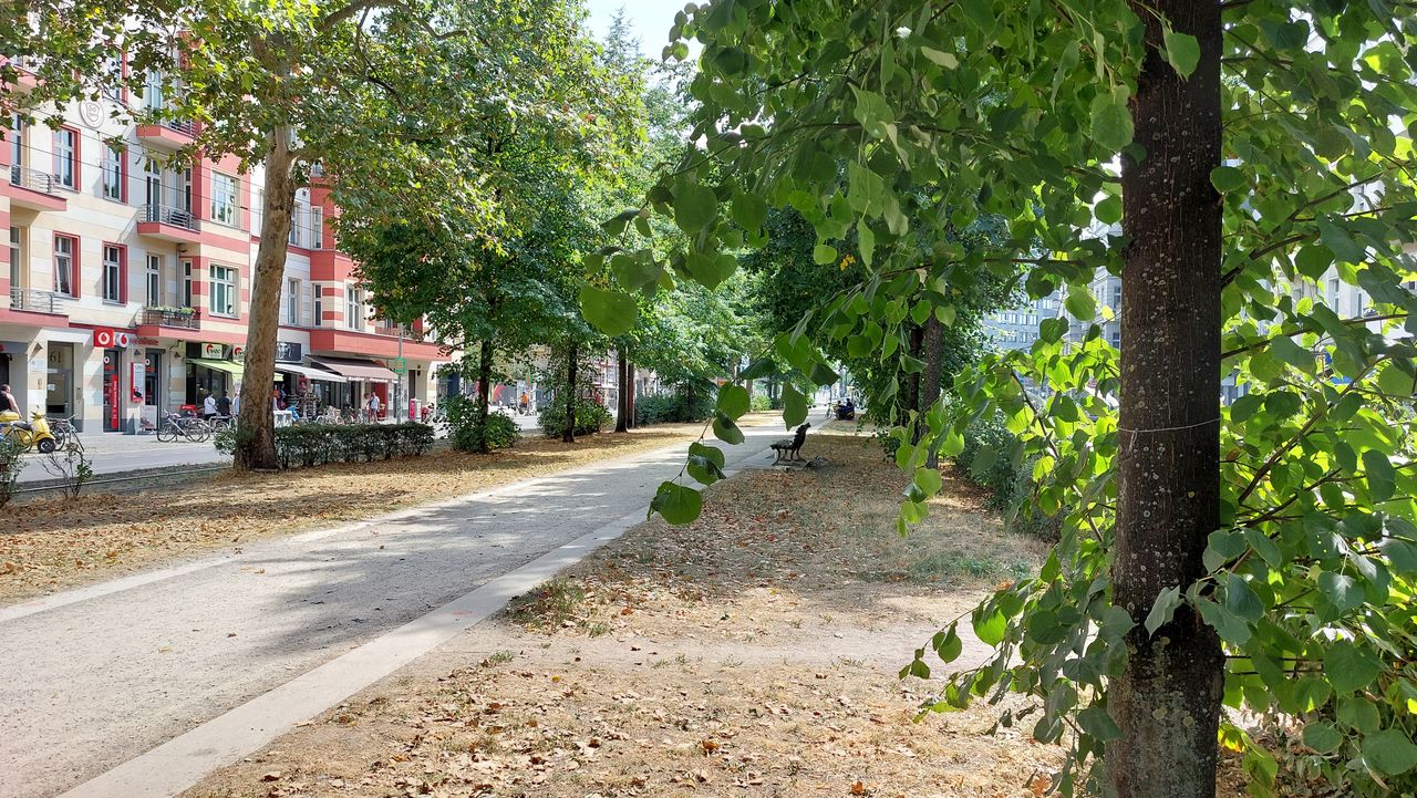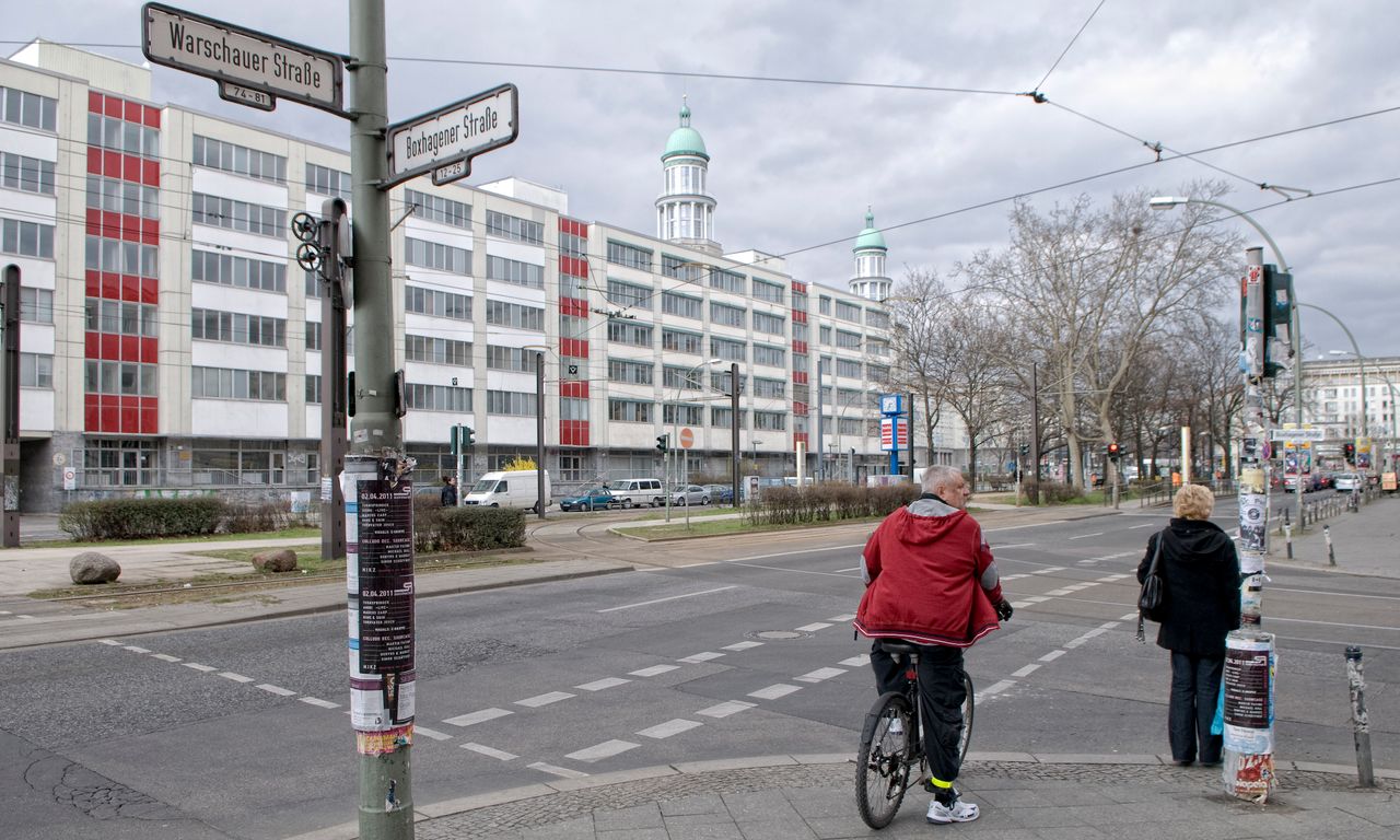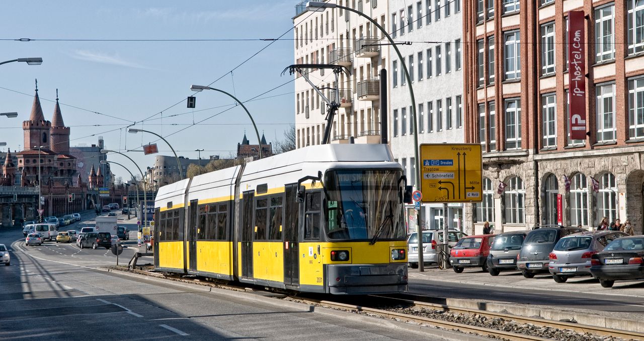 Sehr stark befahrene Straße in Ost-Berlin. Zweispurig mit einer Straßenbahnlinie auf dem Mittelstück. Die Straße ist sehr belebt mit Lebensmittelgeschäften, Cafés und Imbissen.