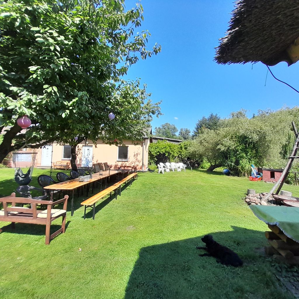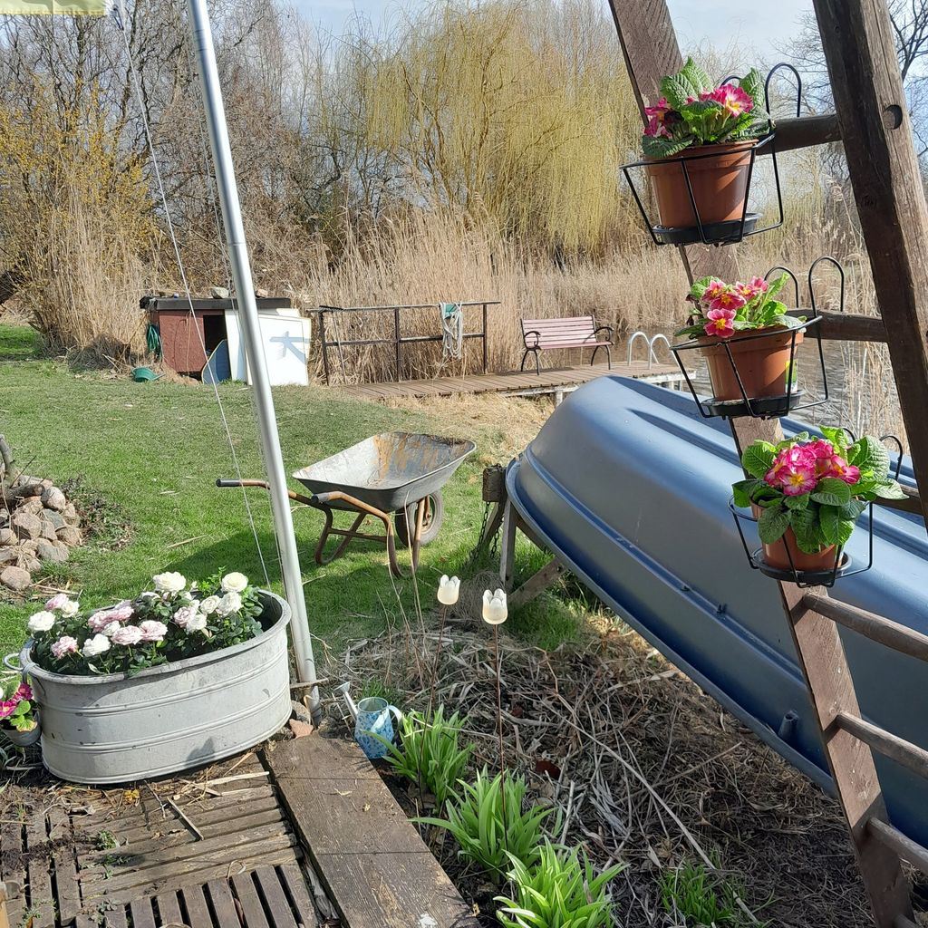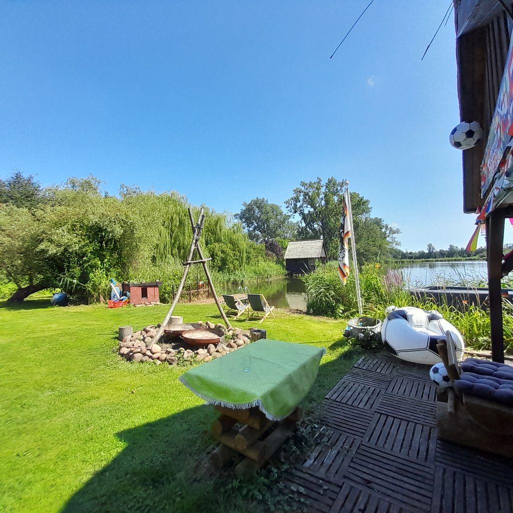Es gibt ein Kajak, ein Ruderboot und einen kleinen Steg. Es befindet sich ferner ein Laufentenstall auf dem Grundstück, die 8 Laufenten sind größtenteils handzahm und freilaufend in Symbiose mit den 2 Hunden und Katzen.
