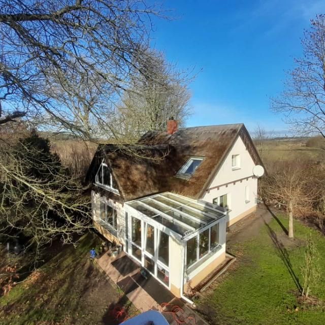Es handelt sich um ein Wassergrundstück in Alleinlage mit 18000 m2 eigener Seefläche und 5000 m2 Grundstück. Auf dem Grundstück befindet sich ein Reetdachhaus (Hauptgebäude) mit 100m2 Wohnfläche (4 Zimmer, Küche, 2 Bäder, Keller), ein Gästehaus mit integrierter offener Garage (Wohnfläche ca. 50 qm/Wohnzimmer mit Küche, Schlazimmer, Bad mit Sauna), ein Pfahlhaus auf dem See (ca. 20qm Wohnfläche), einer Scheune (ca. 20 qm) und einem begrünten (Kartoffel)„Bunker“ (ca.6 qm). Ferner befindet sich direkt am Seeufer ein Pavillon (ca. 25 qm) mit großer Feuerstelle und ein Gewächshaus (ca.15 qm). Ein Saunafass mit Liegepodest direkt am Wasser runden das Ambiente ab.
