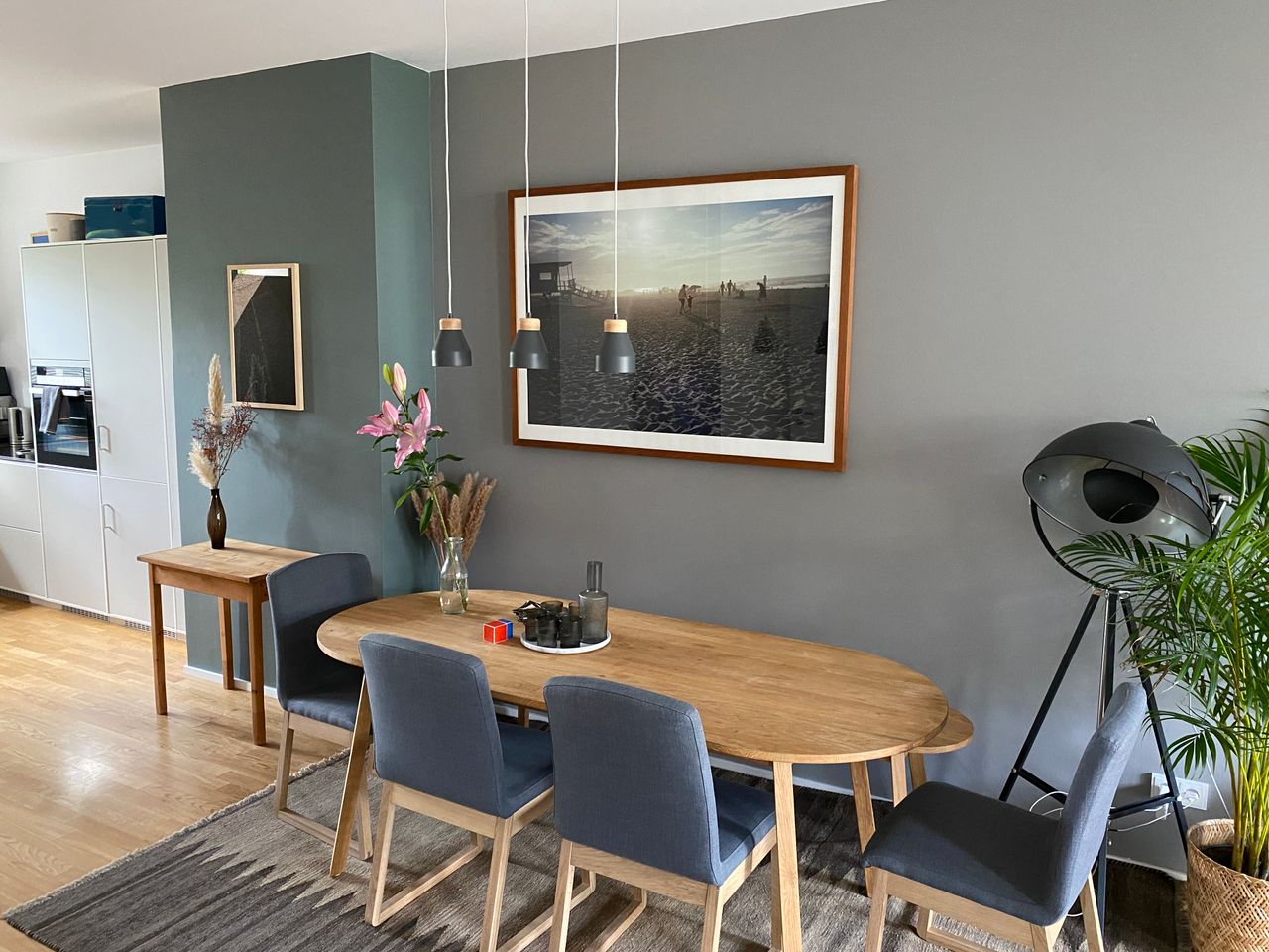 Viele Wände sind farblich abgesetzt. Die Einrichtung ist minimalistisch skandinavisch.