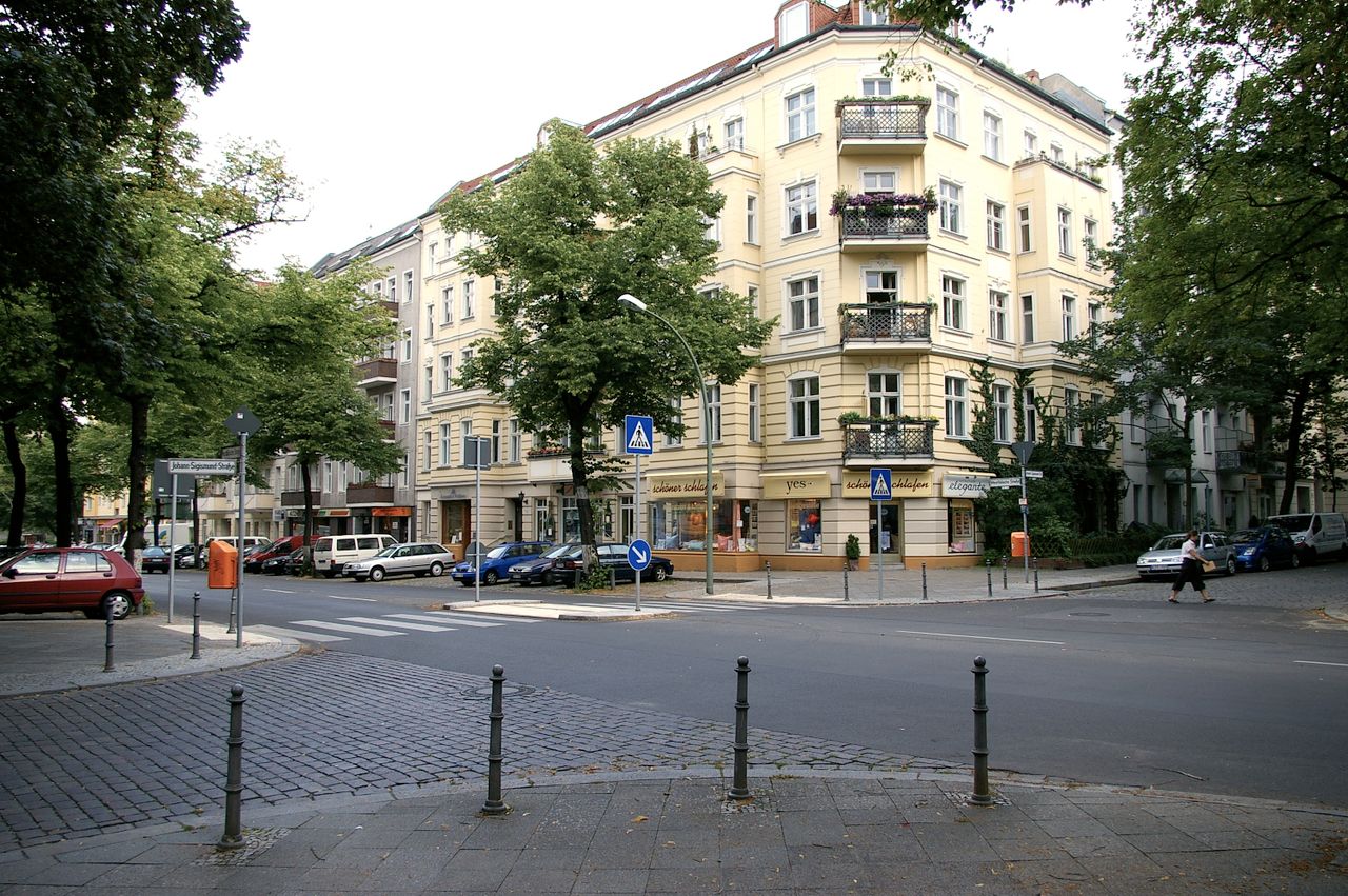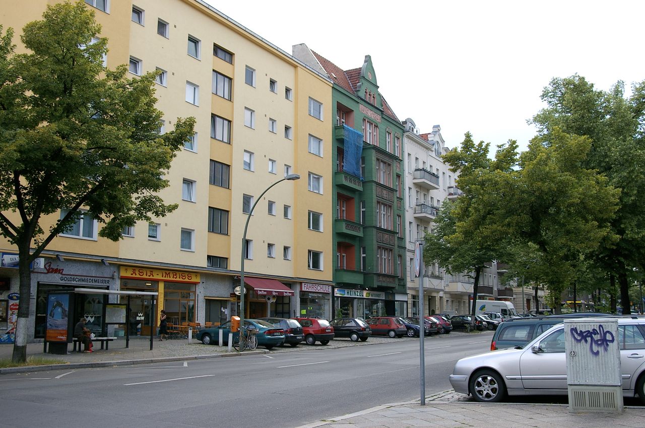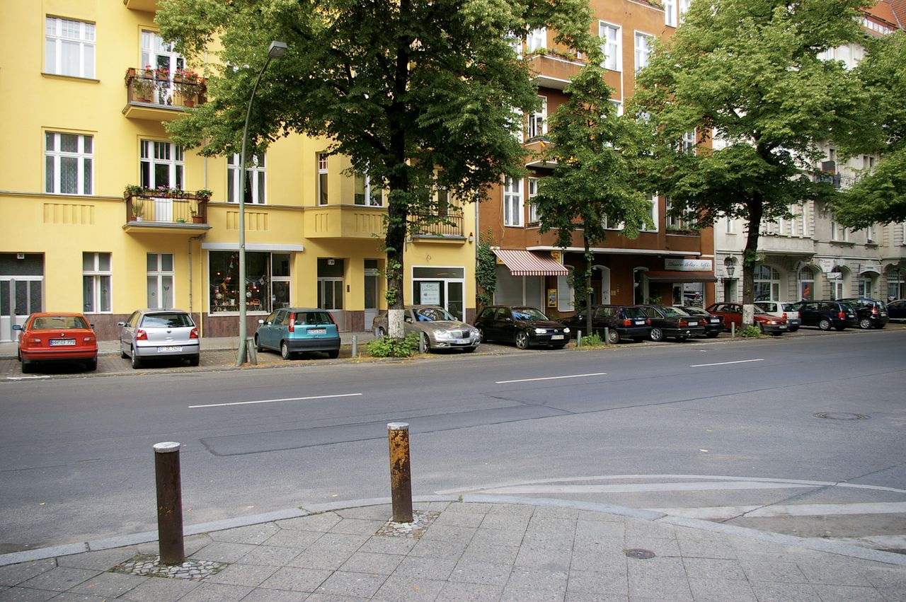 Große befahrene Straße, umgeben von Wohnhäusern. Die Straße endet am Fehrbelliner Platz.