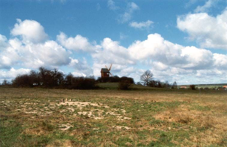Freistehende Windmühle mit Blick auf das Dörfchen Borne