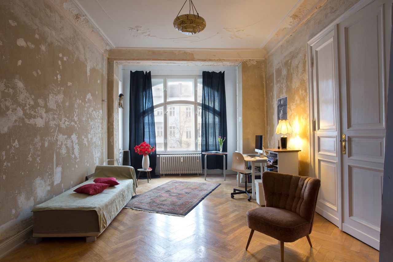 Charme eines unrenovierten Altbaus, Parkett, Dielen, untapezierte Wände mit sichtbaren Verspachtelungen, Balkon und frz. Balkon, Erker mit großem Rundbogenfenster. Flügeltüren.