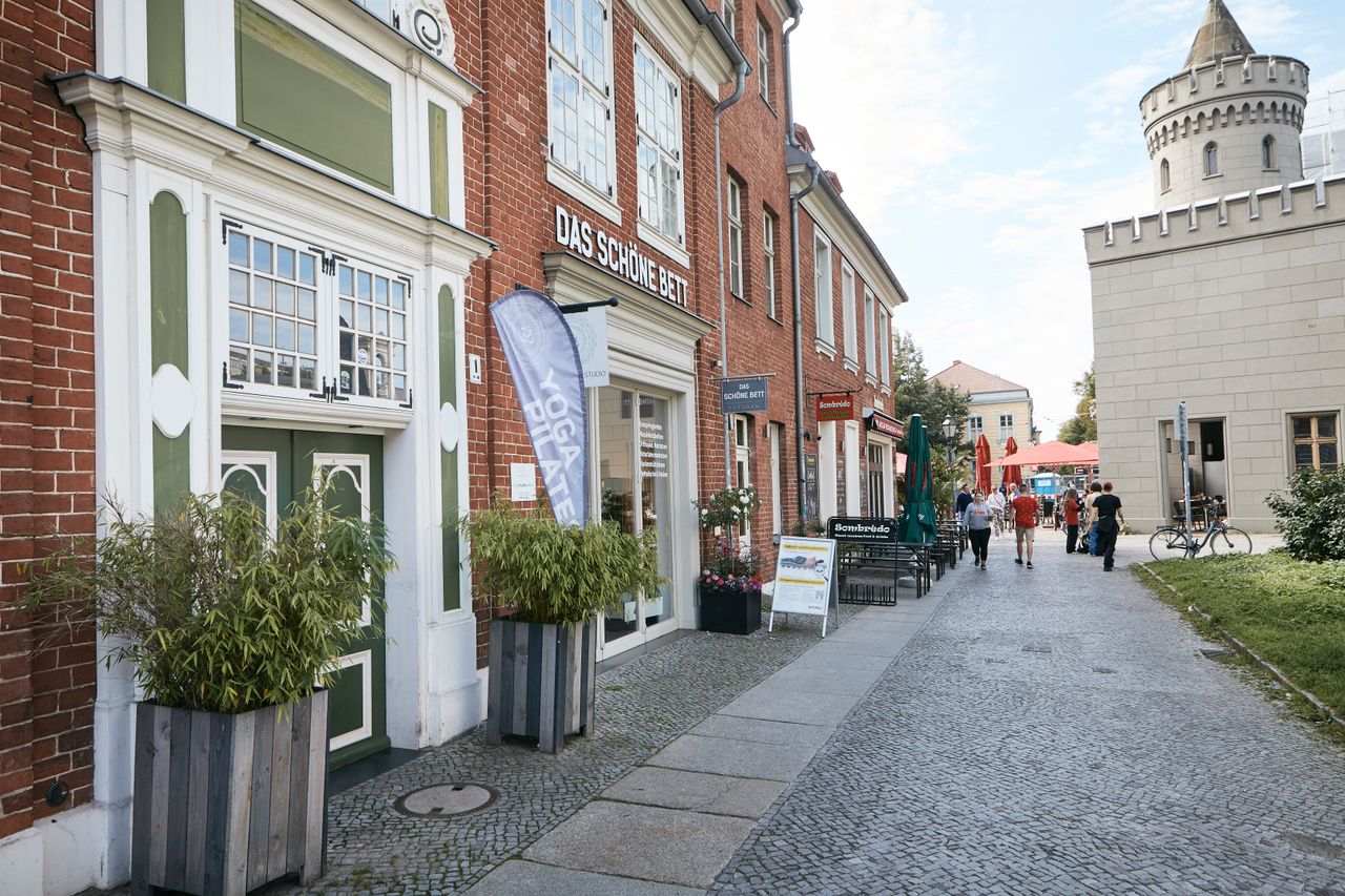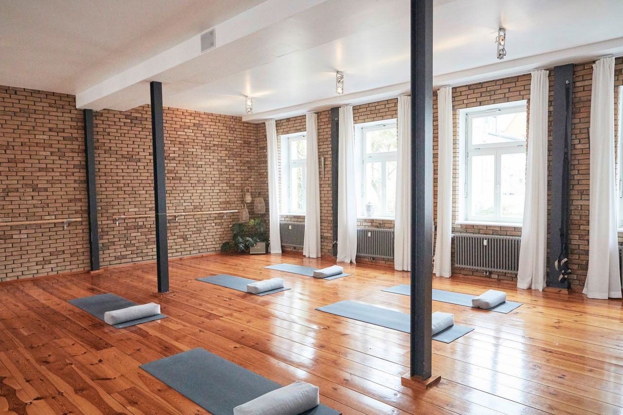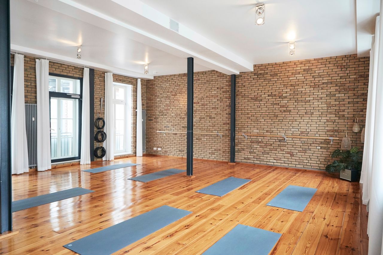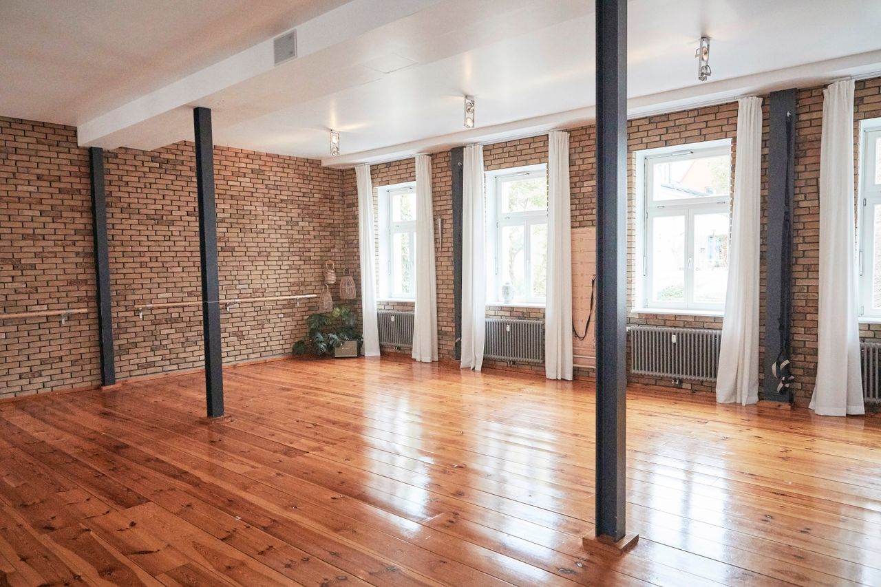 Das lichtdurchflutete Studio hat einen charmanten, urbanen Loftcharakter und befindet sich im Herzen von Potsdam am Nauener Tor im Holländischen Viertel. Die Metalltreppe im Innenhof führt in´s 1. OG, wo sich der große, modern stilisch eingerichtet Raum befindet. Markant ist die rustikale verklinkerte Steinwand im Industielook. Das Studio wird aktuell für Yoga-, Pilates- und Tanzkurse genutzt. Es haben 20 Matten und 20 TeilnehmerInnen Platz, Euipment und Pilatesgeräte sind vorhanden. Parkmöglichkeit gibt es vor der Tür in der Kurfürstenstrasse sowie in der kleinen Hegelallee.