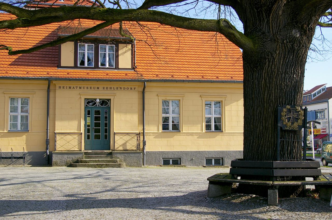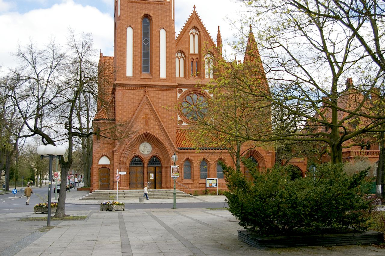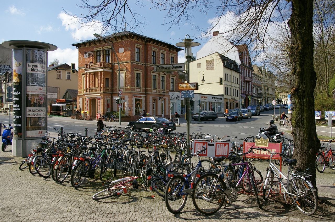 Große, sehr stark befahrene Ampelkreuzung von Potsdamer Strasse und Clayallee, S-Bahnhof, Marktständer, Gebäude aus fast allen Stilepochen