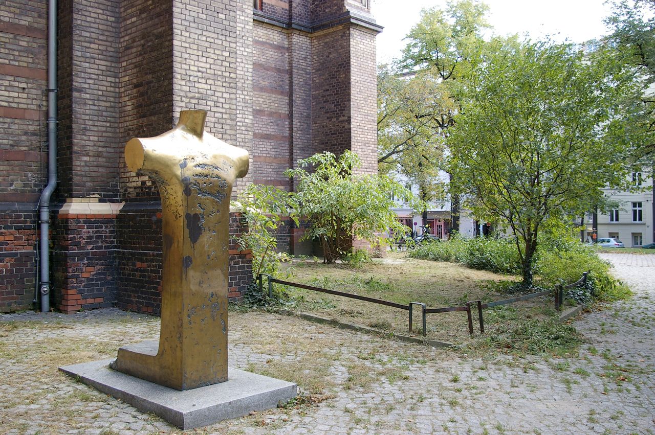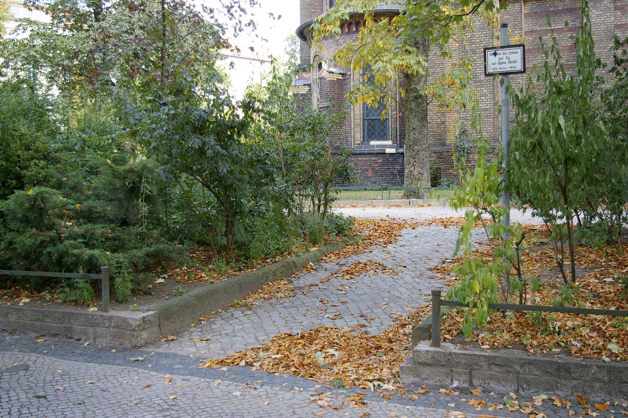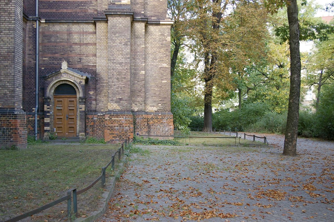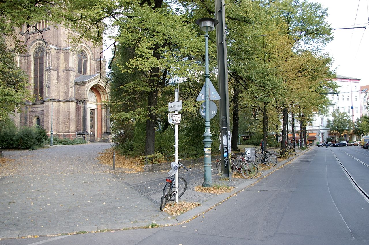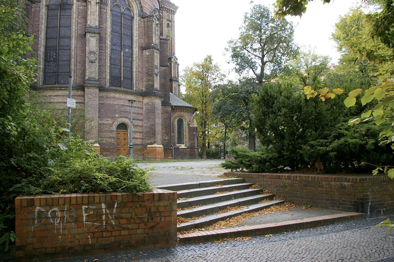 Kleiner begrünter, hügeliger Platz mit Kirche (Zionskirche).