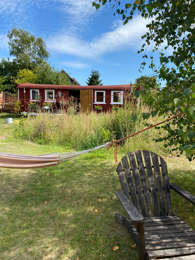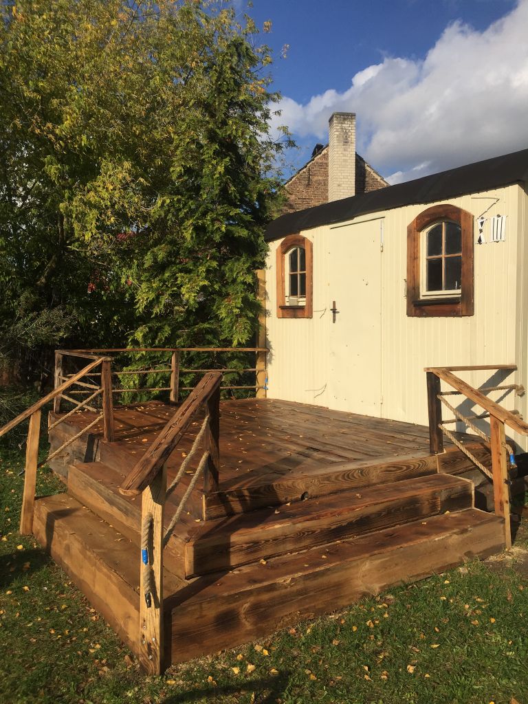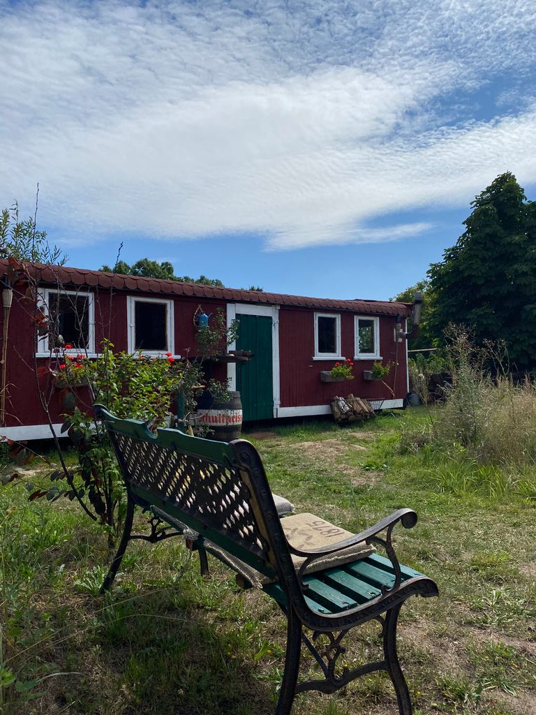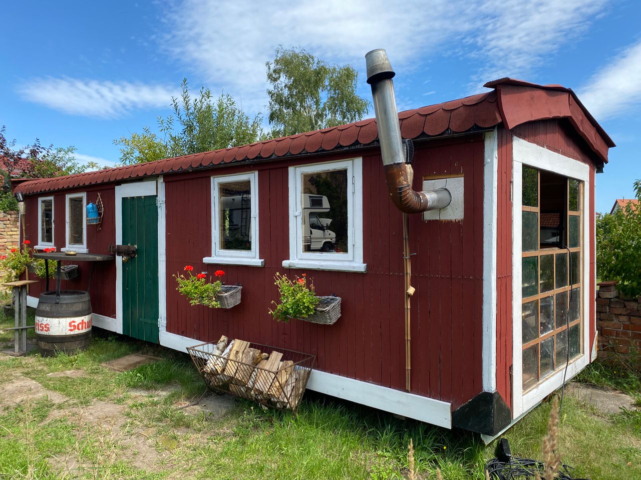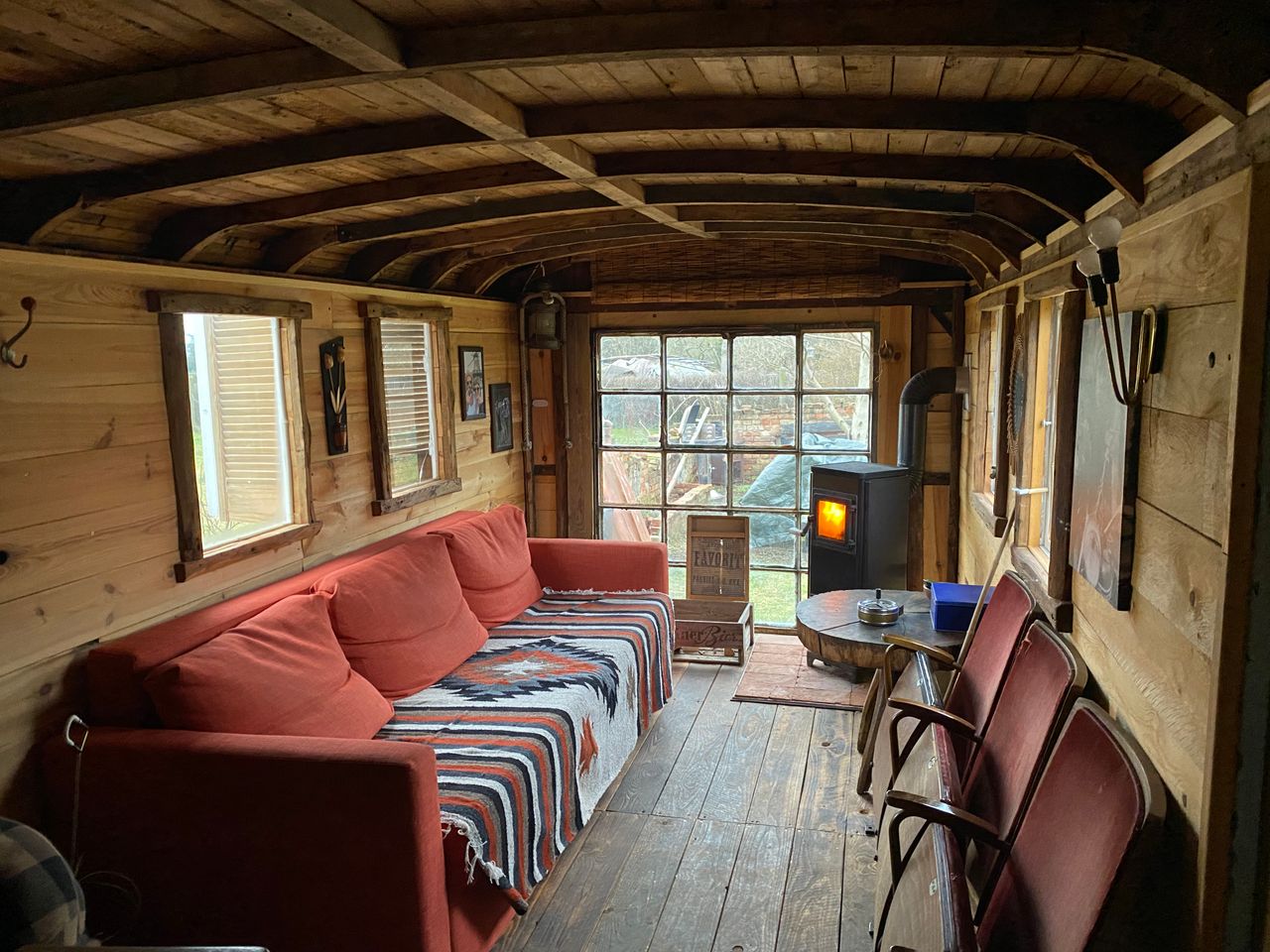 Ein alter DDR-Zirkus-Bauwagen umgebaut zu einer Bar mit Kamin und abgetrenntem Raum als Sauna