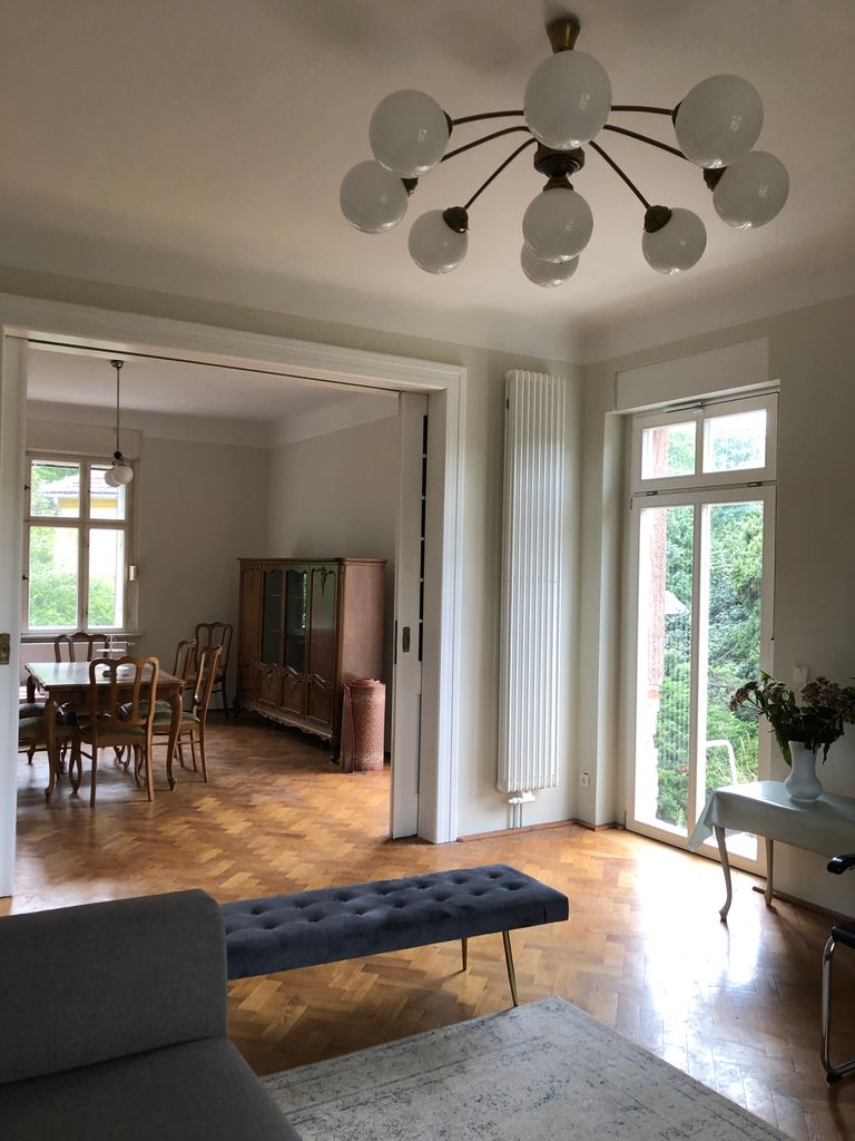 Innen ist die Villa vollständig originalgetreu saniert mit Originalparkett im EG originalen aufbereitetem Dielenboden im 1.OG.